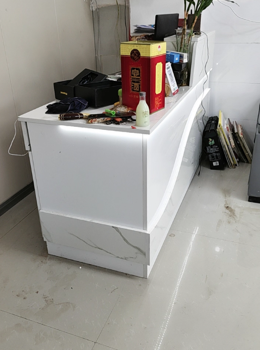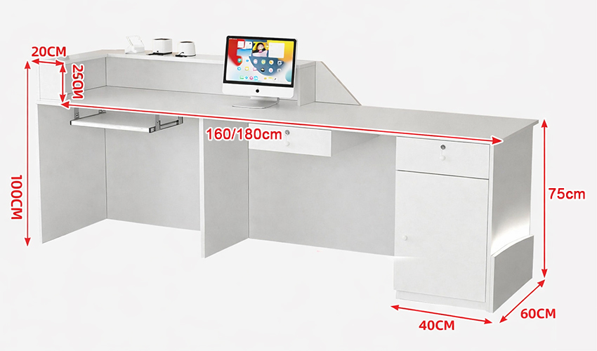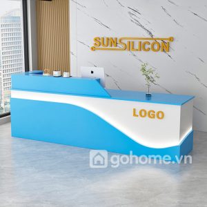 Mặt quầy dài và rộng rãi, đủ không gian để bố trí 2–3 vị trí làm việc cùng lúc. Phần mặt trên được thiết kế phân tầng hợp lý, đảm bảo sự riêng tư cho khu vực làm việc của nhân viên lễ tân.