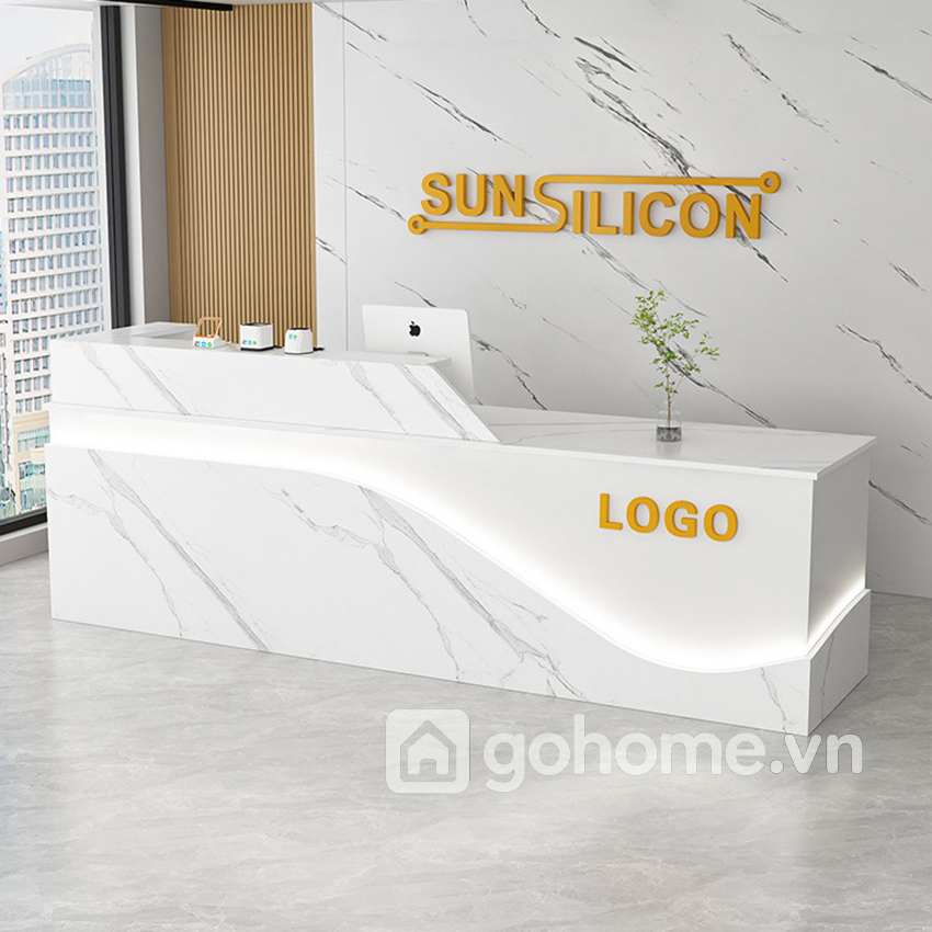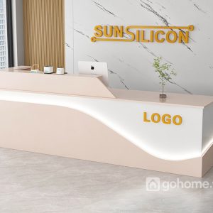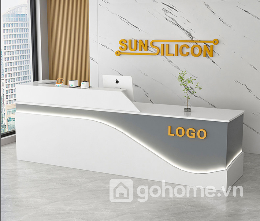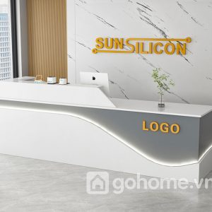 Mẫu quầy trong hình gây ấn tượng mạnh với thiết kế uốn lượn mềm mại, kết hợp hài hòa giữa tông gỗ tự nhiên ấm áp và mảng trắng tinh tế. Phần LED hắt sáng âm chân quầy tạo hiệu ứng nổi khối hiện đại, giúp tổng thể thêm phần sang trọng và cuốn hút. Đây là lựa chọn lý tưởng cho văn phòng công ty cao cấp, tập đoàn doanh nghiệp, showroom trưng bày, trung tâm công nghệ hoặc không gian làm việc hiện đại.