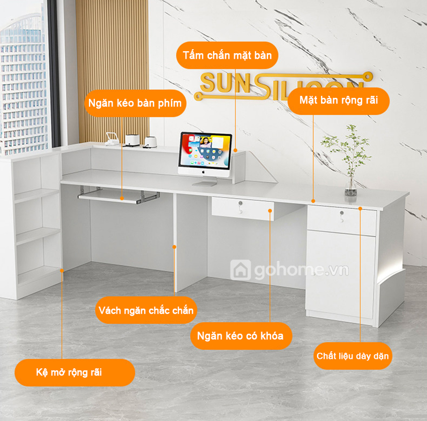 Bên trong quầy có thể bố trí ngăn kéo, hộc tủ, khoang chứa CPU giúp lưu trữ tài liệu gọn gàng, chuyên nghiệp. Đây là giải pháp tối ưu cho quầy lễ tân văn phòng lớn hoặc sảnh công ty đông khách.