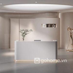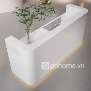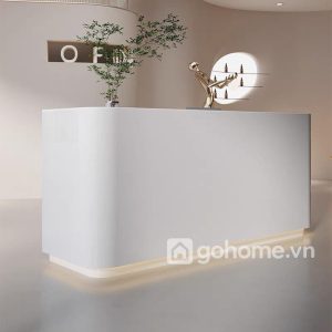 Không cần chi tiết rườm rà, mẫu quầy lễ tân nhỏ gọn chinh phục người nhìn bằng thiết kế đường cong chữ U bo tròn ở hai đầu, kết hợp cùng tone trắng acrylic sáng bóng và hệ thống đèn LED âm tường dưới chân quầy. Cả tổng thể tạo nên cảm giác “lướt nhẹ” – sang trọng mà không hề nặng nề.