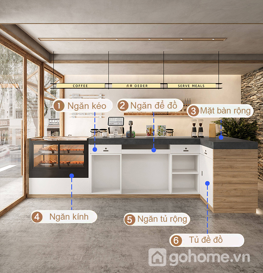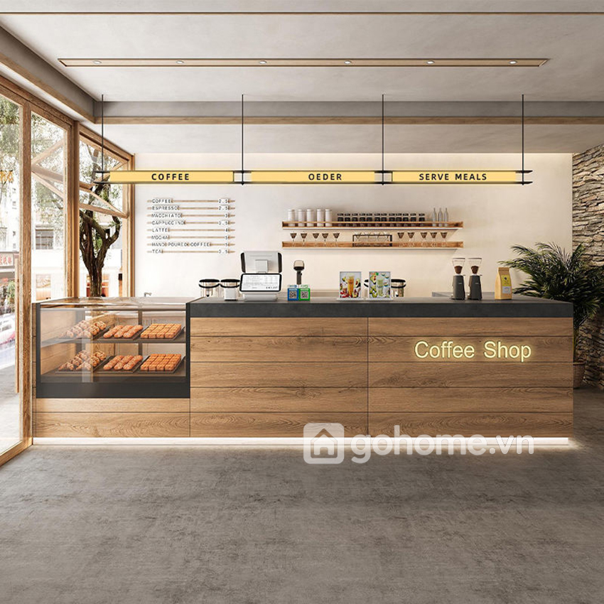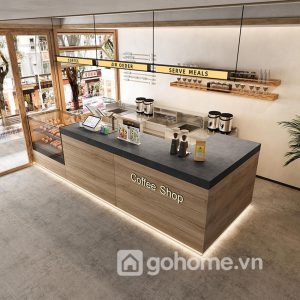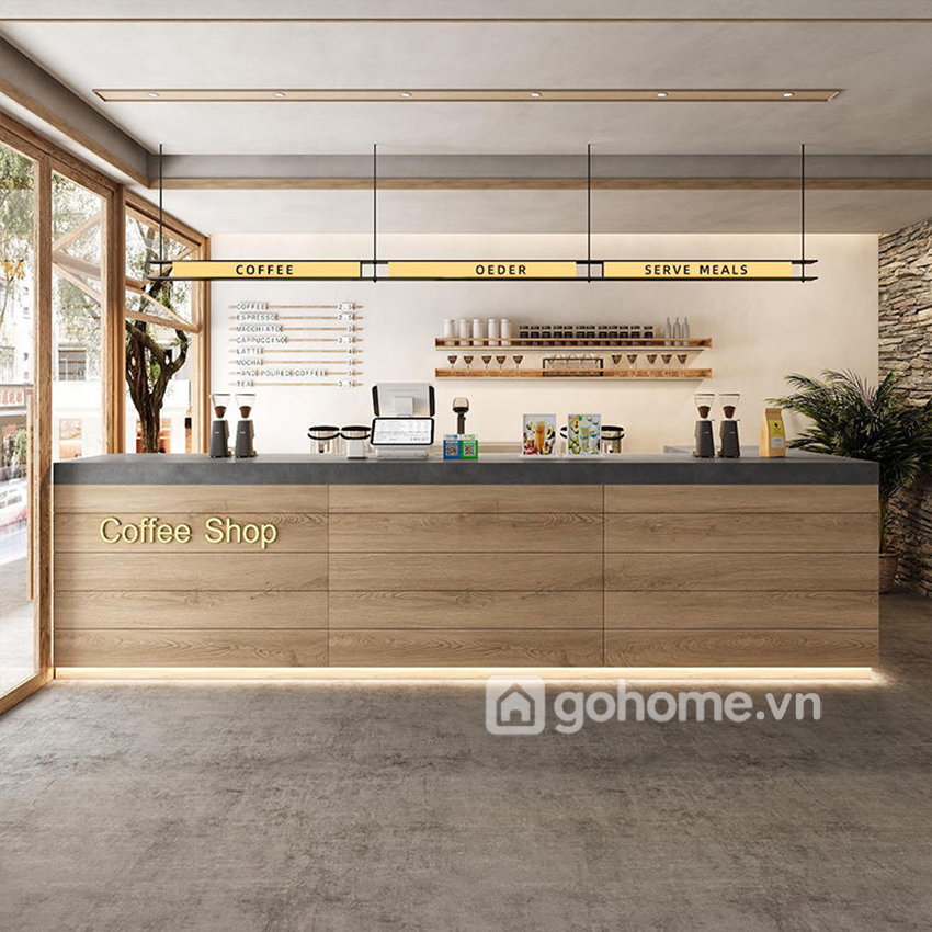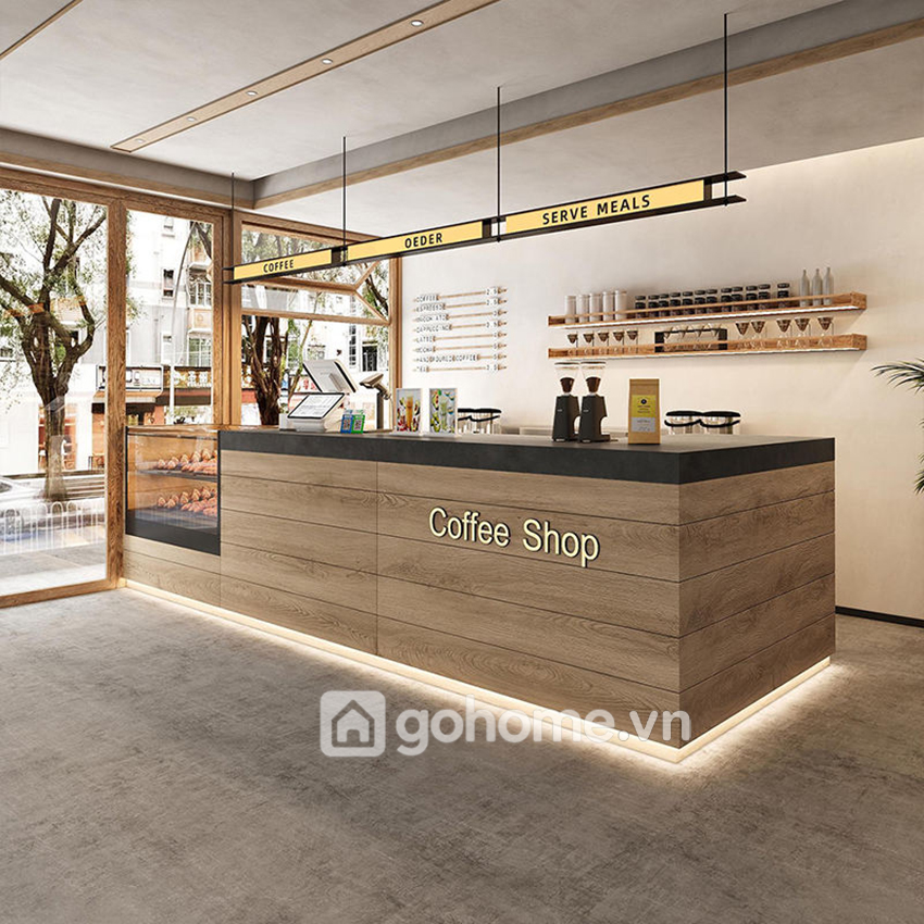 Tại Gohome, mẫu quầy này có thể tùy chỉnh kích thước, màu gỗ, chất liệu mặt đá hoặc bố trí ngăn kệ bên trong tùy theo diện tích thực tế và nhu cầu sử dụng của quán.