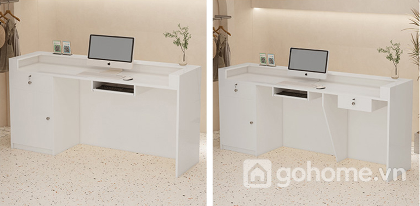 Dù sở hữu thiết kế trẻ trung và mềm mại, quầy vẫn đảm bảo đầy đủ công năng với mặt bàn rộng rãi để đặt máy tính, máy POS, tài liệu và phụ kiện trang trí.