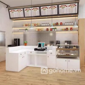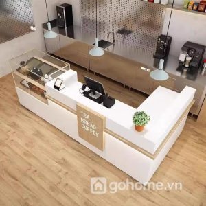Tại Gohome, mẫu quầy thanh toán cho quán cafe này có thể đặt theo kích thước – mặt bằng – bố cục riêng của từng cửa hàng. Có thể làm: