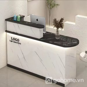 Lớp phủ Melamine ở mặt bàn vừa bền màu, dễ lau chùi, lại tạo cảm giác ấm áp, sang trọng. Thân quầy được sơn phủ giả đá nhám mịn, tạo cảm giác cao cấp và dễ dàng kết hợp với các vật liệu decor khác như gương, inox, đèn LED…
