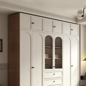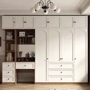 Tone trắng kem phối vân gỗ tạo nên cảm giác thanh lịch nhưng vẫn ấm áp. Thiết kế tủ cao chạm trần không chỉ tận dụng tối đa chiều cao tường, mà còn mở rộng khả năng lưu trữ vượt trội, đáp ứng mọi nhu cầu cho một gia đình hiện đại.