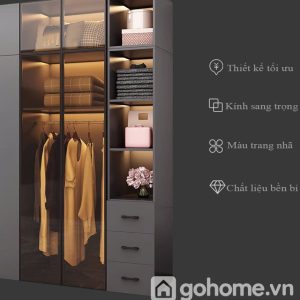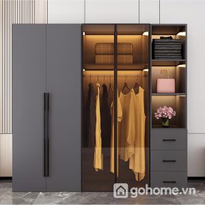 Với thiết kế hiện đại, cửa kính mờ kết hợp hệ thống đèn LED thông minh, sản phẩm không chỉ đơn thuần là chiếc tủ đựng quần áo, mà còn giống như một “showroom mini” ngay trong nhà.