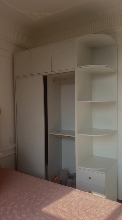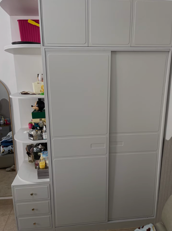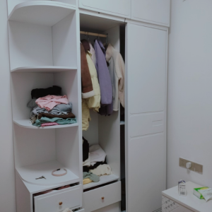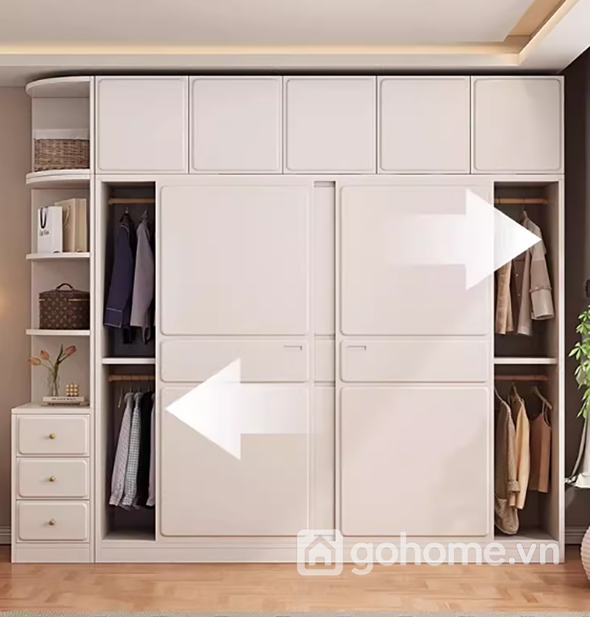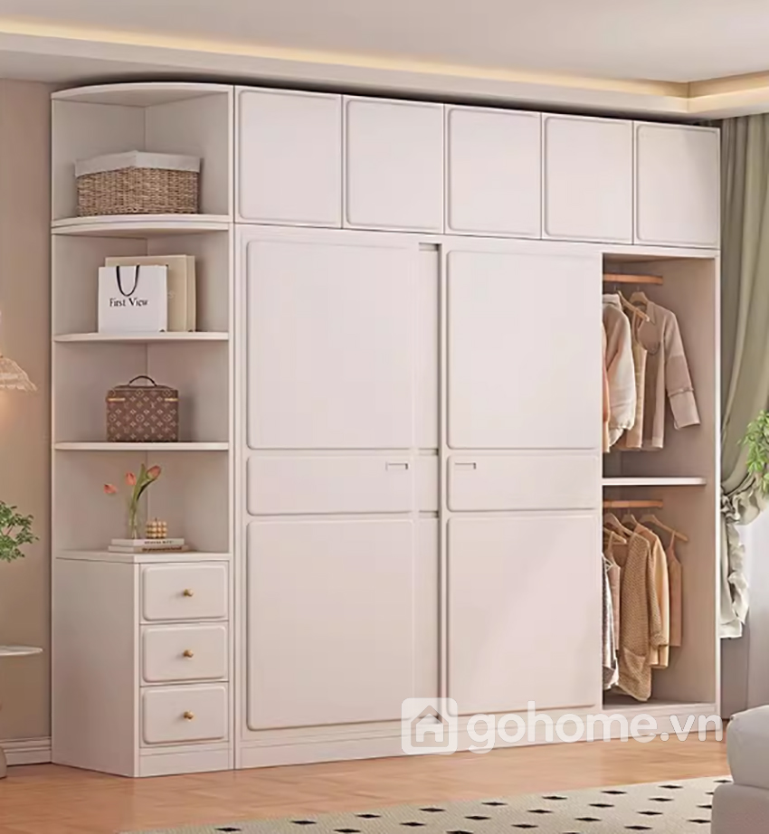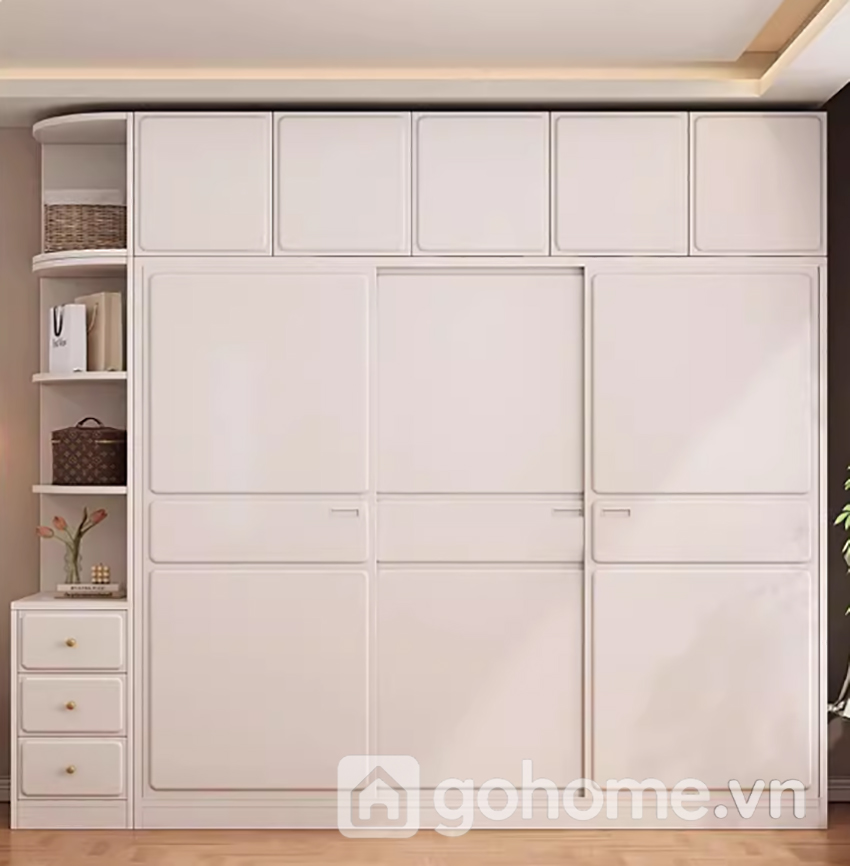 Ngoài ra, hệ kệ trang trí tích hợp bên hông tủ giúp gia chủ có thêm không gian trưng bày sách, túi xách, hộp trang sức hoặc các vật dụng decor nhỏ xinh. Nhờ vậy, chiếc tủ không chỉ đóng vai trò lưu trữ quần áo mà còn trở thành điểm nhấn nội thất giúp căn phòng thêm phần sinh động.