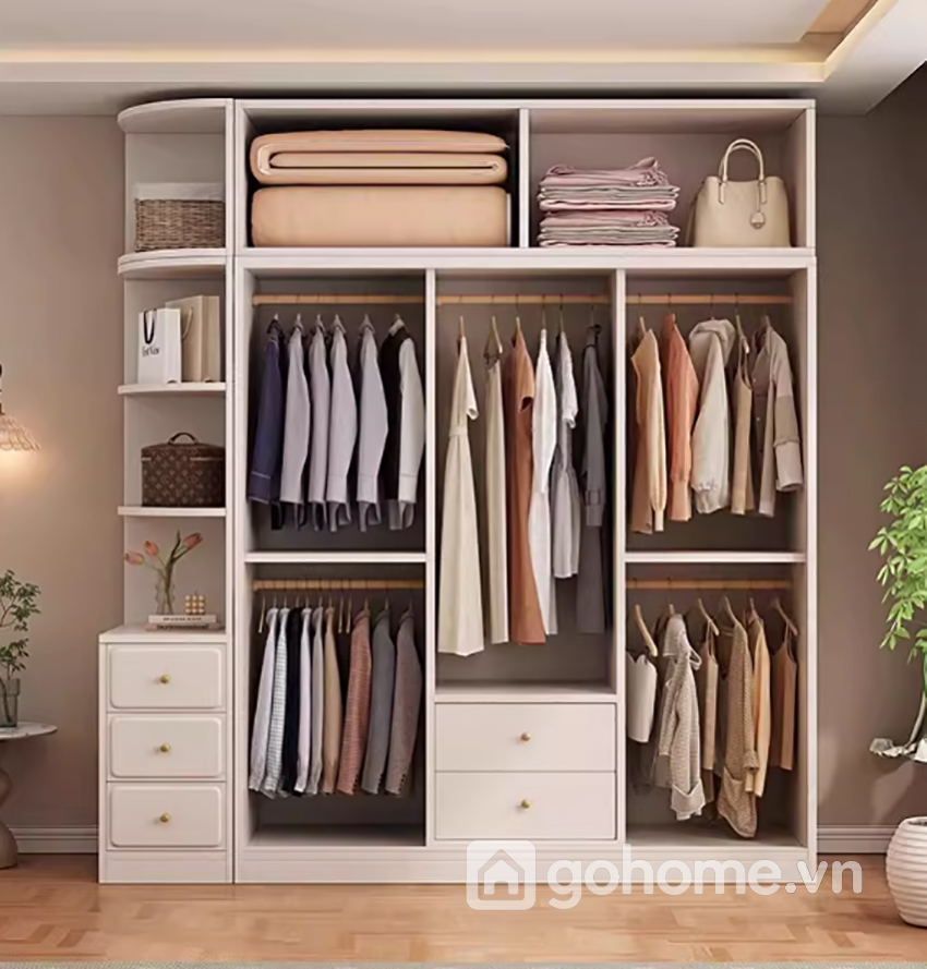 Bên cạnh chức năng lưu trữ quần áo, chiếc tủ còn được thiết kế thêm kệ trang trí mở bên hông vô cùng tiện dụng. Bạn có thể tận dụng khu vực này để đặt túi xách, giỏ decor, sách hoặc các vật dụng nhỏ thường xuyên sử dụng.
