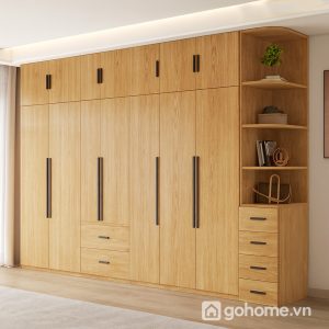 Tủ áo gỗ công nghiệp lưu trữ rộng rãi được thiết kế với nhiều ngăn chứa thông minh, từ khoang treo đồ, kệ gấp quần áo đến hộc kéo và kệ trang trí. Chất liệu gỗ công nghiệp MDF cao cấp giúp tủ có độ bền cao, chống cong vênh, mối mọt và dễ vệ sinh.