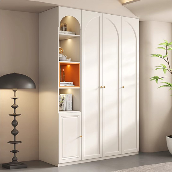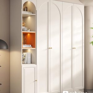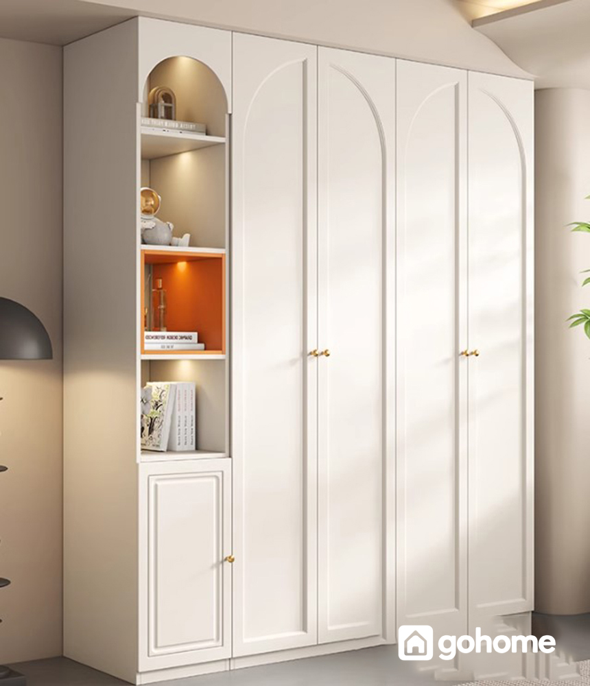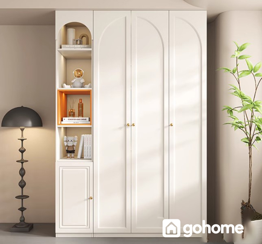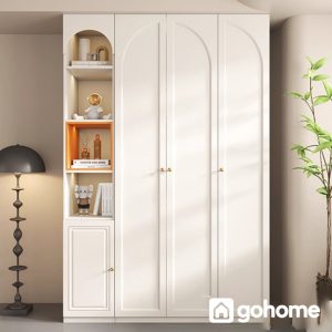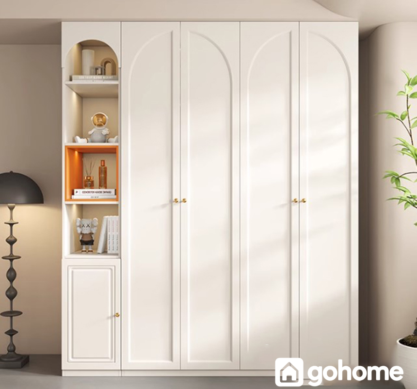 Điểm cộng lớn nằm ở phần kệ trang trí liền kề tích hợp bên hông, nơi bạn có thể thoải mái bày trí sách, tượng decor, nước hoa hay túi xách – vừa tiện lợi vừa giúp chiếc tủ trở thành tâm điểm hút mắt trong không gian phòng ngủ hoặc phòng thay đồ.