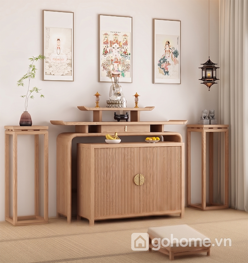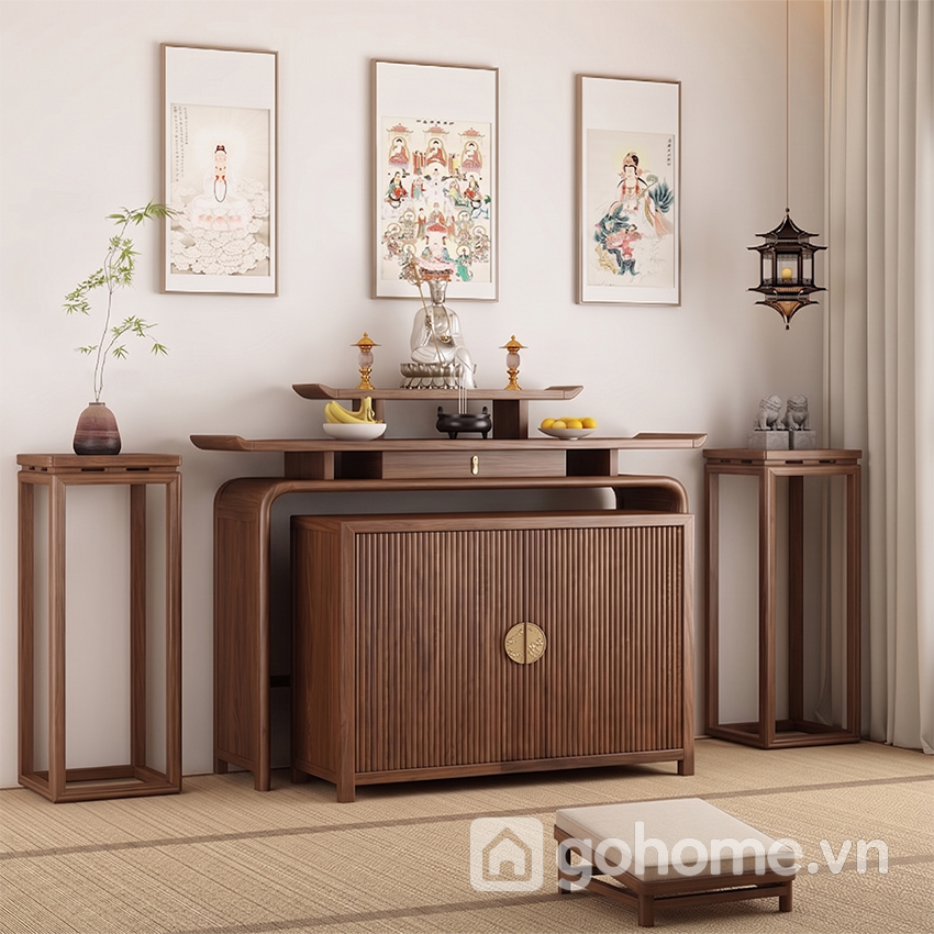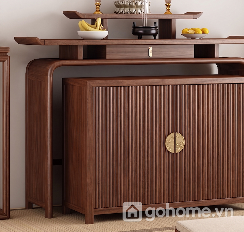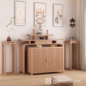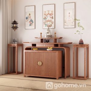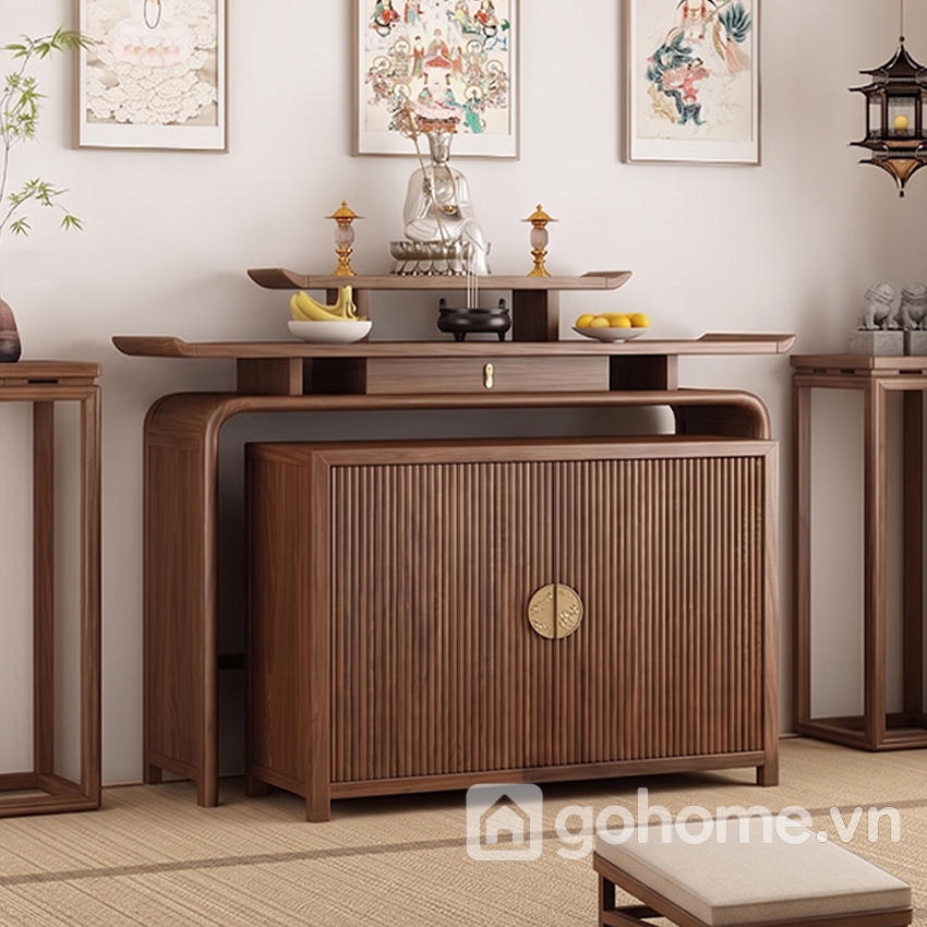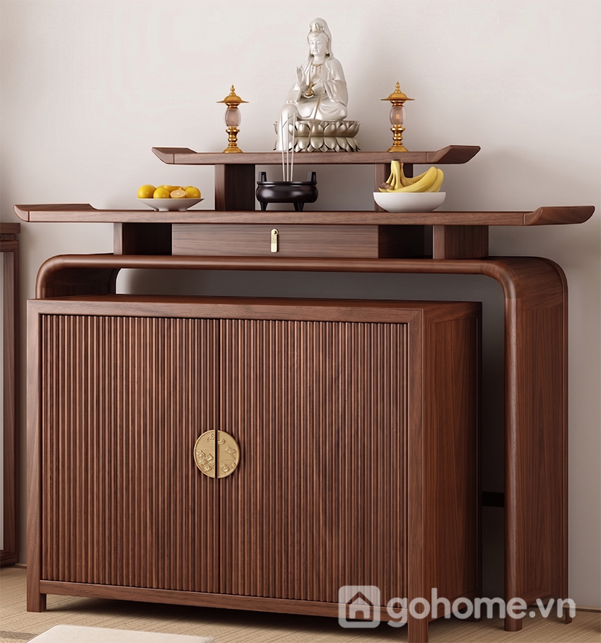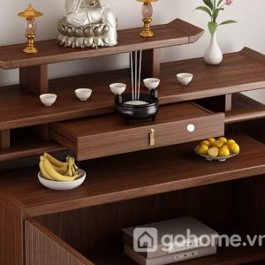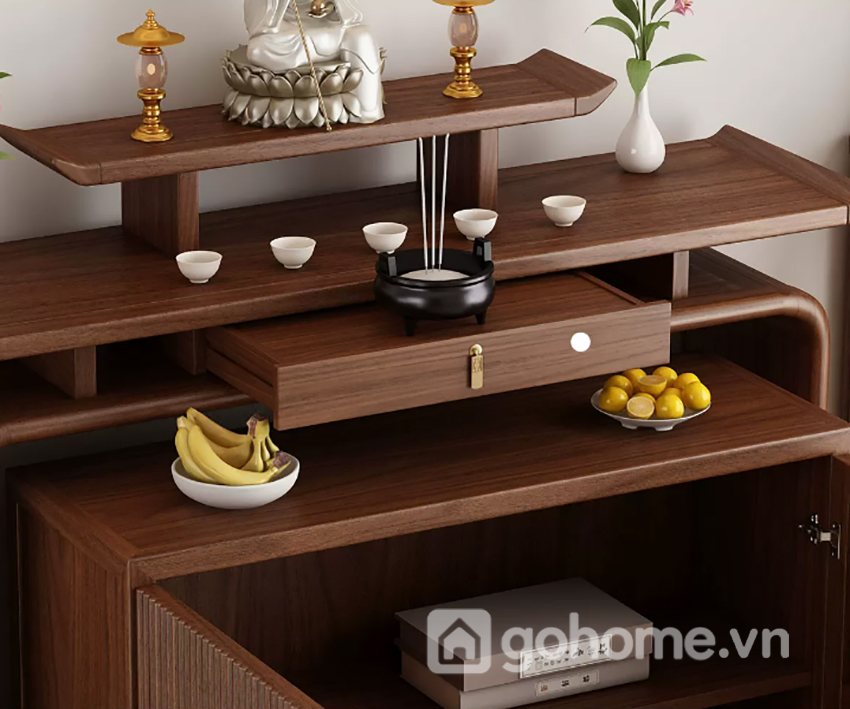 Phần mặt bàn thờ được thiết kế rộng rãi, giúp gia chủ dễ dàng sắp xếp các vật phẩm thờ cúng như bát hương, tượng Phật, đèn thờ, bình hoa hay mâm quả. Bên dưới là hệ tủ lưu trữ tiện lợi, giúp cất giữ các vật dụng thờ cúng một cách gọn gàng và ngăn nắp.