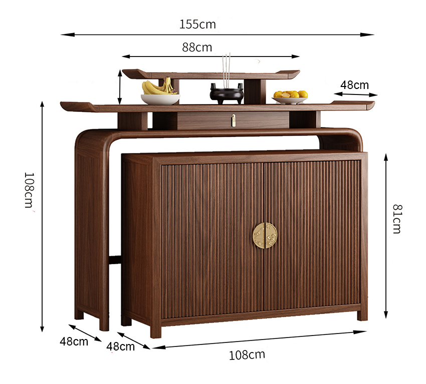 Chiếc tủ bàn thờ gỗ tự nhiên được thiết kế theo phong cách hiện đại nhưng vẫn giữ được sự trang nghiêm cần thiết cho không gian thờ cúng. Điểm nổi bật của sản phẩm nằm ở những đường nét bo cong mềm mại kết hợp với các chi tiết gỗ tinh xảo, tạo nên một tổng thể hài hòa và thanh lịch.