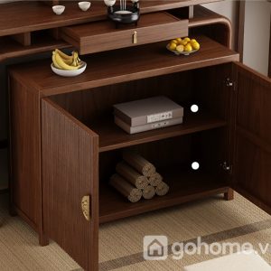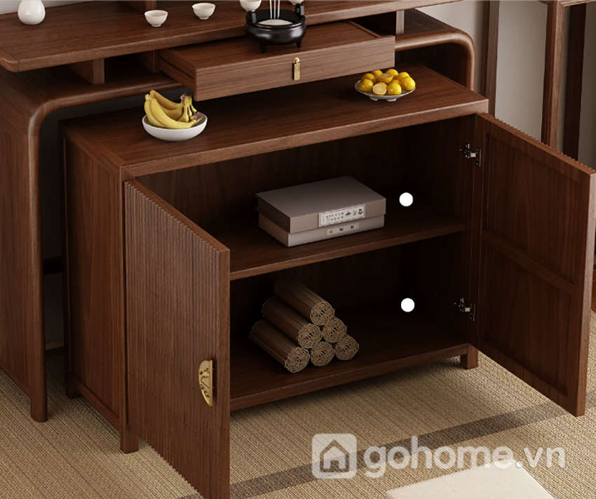 Phía dưới bàn thờ là khoang tủ lớn với cửa đóng kín, giúp gia chủ có thêm không gian lưu trữ tiện lợi.