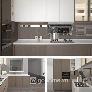 Màu sắc đóng vai trò rất lớn trong phong cách tối giản. Ở mẫu tủ này, tone ghi sáng kết hợp trắng ngọc và xám khói tạo nên sự thư giãn thị giác – vừa ấm áp vừa hiện đại. Phối màu này cực kỳ dễ kết hợp với các vật dụng bếp như: mặt đá trắng, thiết bị bếp đen – bạc, phụ kiện inox hoặc đồ gỗ tự nhiên. Tổng thể tạo nên cảm giác sang trọng nhưng không lạnh lẽo, phù hợp với lối sống trẻ, tinh tế và có chiều sâu.