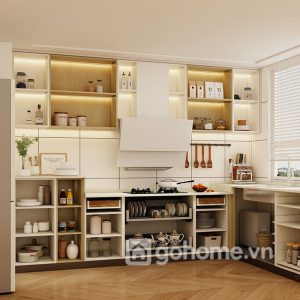 🔹 Tủ trên cao: Dành cho đồ ít dùng, trữ đồ khô, ngũ cốc, trà, gia vị hộp…