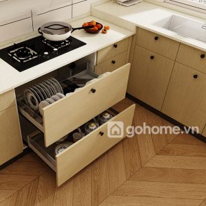 🔹 Tủ dưới: Là “kho” chứa nồi, chảo, máy xay, hộp đựng thức ăn…