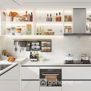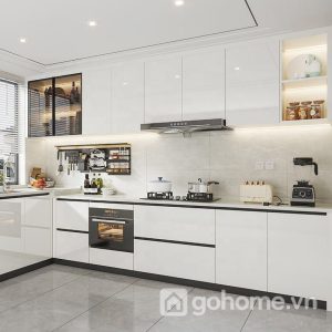 Kết hợp cùng tone màu sáng bóng, mặt tủ phản chiếu ánh sáng tốt, giúp căn bếp luôn sáng bừng – sạch sẽ – thoáng đãng, đặc biệt phù hợp với các căn hộ chung cư, studio hoặc nhà phố diện tích nhỏ.