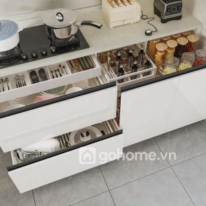 Bên dưới là hệ tủ ngăn kéo cỡ lớn, giúp lưu trữ xoong nồi, bát đĩa cực gọn gàng, kèm theo khay chia thông minh cho từng công năng. Phần bếp nấu – chậu rửa bố trí đối xứng theo chuẩn tam giác vàng trong thiết kế nội thất bếp.