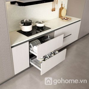 Hệ bản lề và ray trượt giảm chấn cao cấp, giúp đóng mở nhẹ nhàng, êm ái.