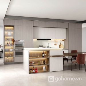 Phần tủ trên được bố trí cao sát trần, tăng khả năng lưu trữ; trong khi tủ dưới tích hợp ngăn kéo trượt, khoang chứa đồ khô, và ngăn riêng cho thiết bị điện. Đặc biệt, khu vực đảo bếp thông minh vừa có thể dùng để chuẩn bị món ăn, vừa tích hợp kệ trưng bày rượu, ly và phụ kiện bếp cực kỳ sang trọng.