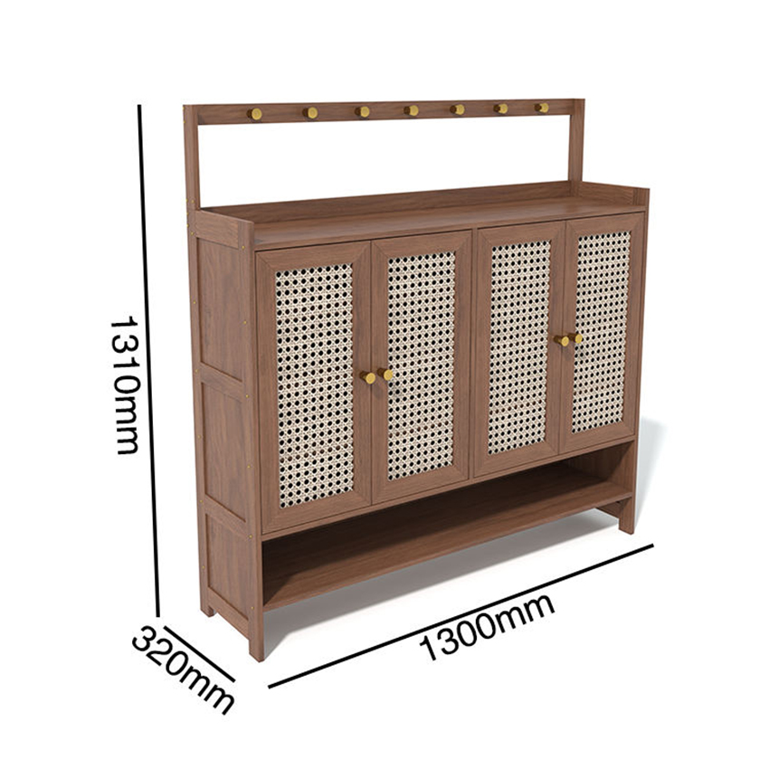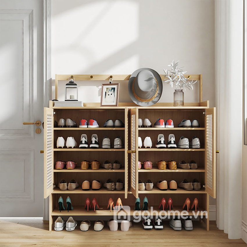Điểm nổi bật của mẫu tủ này chính là phần cánh lưới mây/tre – tạo hiệu ứng nhìn xuyên hắt ánh sáng, mang lại cảm giác mở thoáng và tự nhiên hơn. Khác với tủ giày kín hoàn toàn, phần lưới mây vừa giúp lưu trữ vừa tạo “hơi thở” cho không gian, rất phù hợp với phong cách nội thất thiên nhiên, boho, Japandi, hoặc những ai yêu sự gần gũi với thiên nhiên.