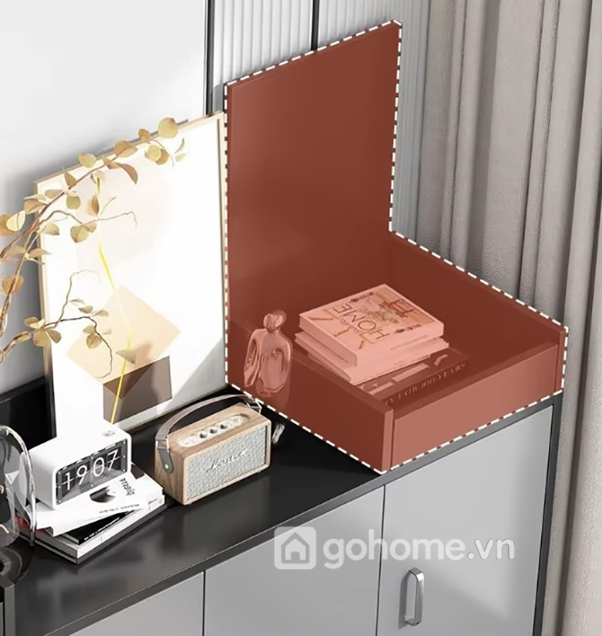 Bên cạnh việc phân chia các ngăn lưu trữ khoa học, tủ còn có thêm ngăn mở flip top dạng nắp bật trên cùng – một điểm nhấn sáng tạo cực kỳ tiện lợi, giúp cất nhanh đồ dùng nhỏ như ví, kính, khẩu trang, đồng hồ…