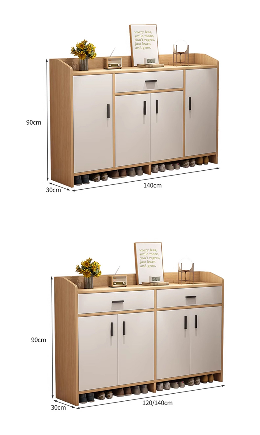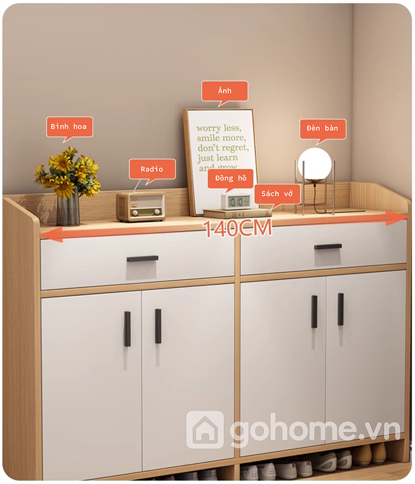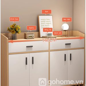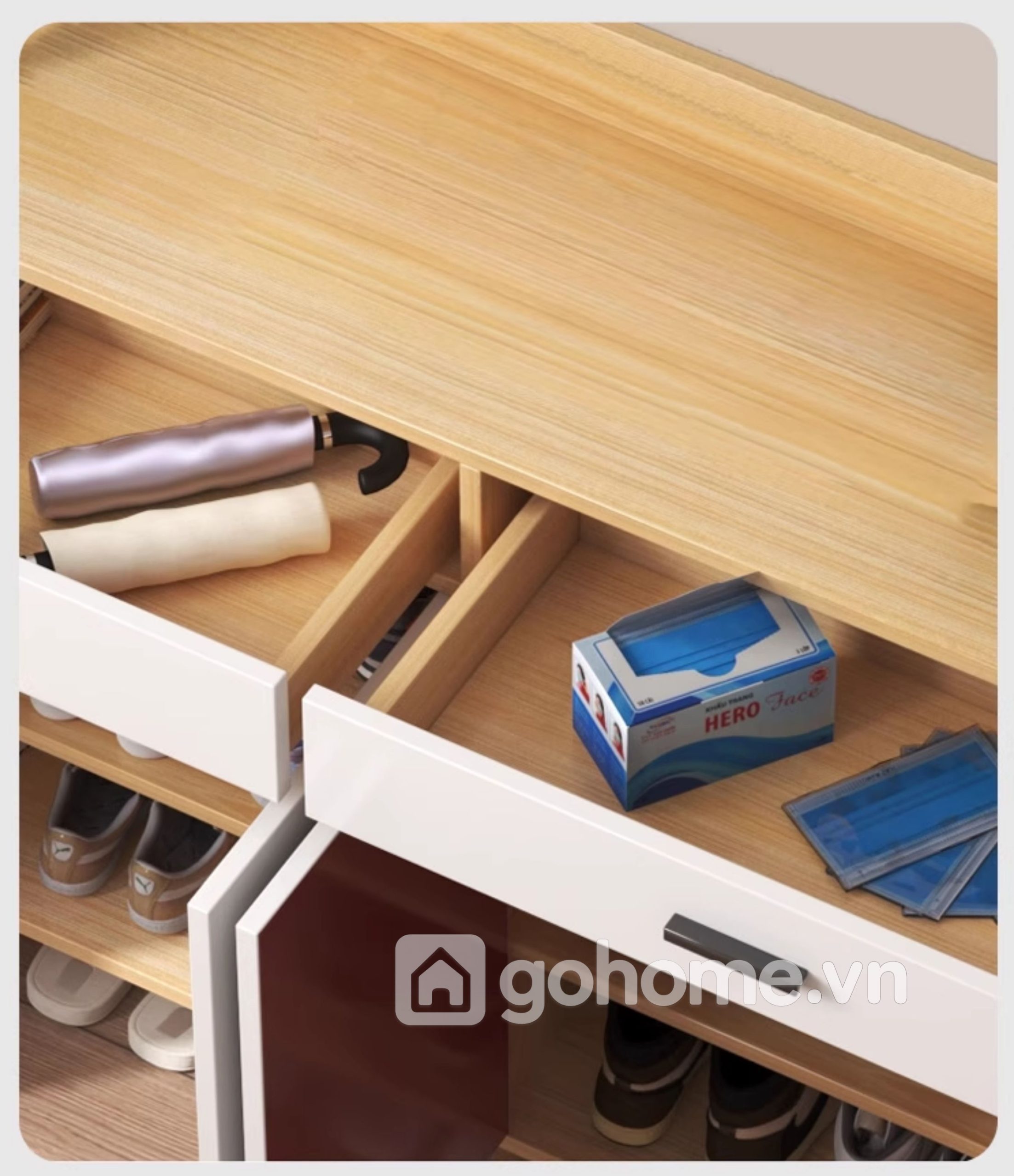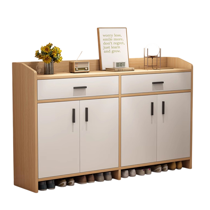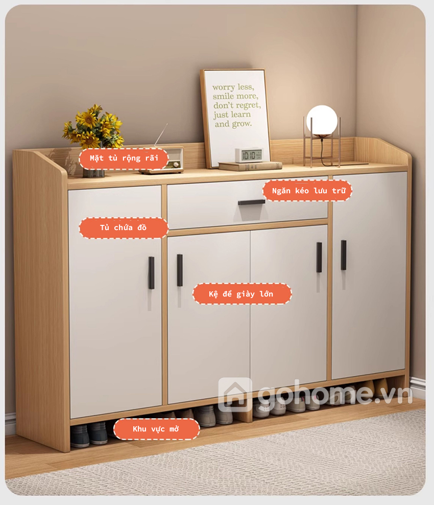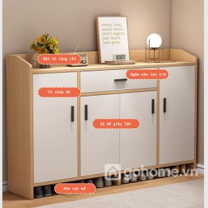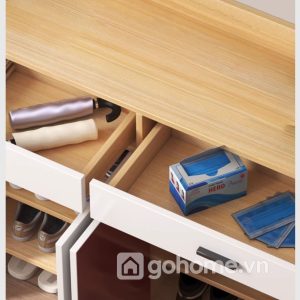 Không chỉ để giày, chiếc tủ còn được chia thành nhiều khu vực lưu trữ thông minh: ngăn kéo tiện lợi, tủ chứa đồ cá nhân, mặt tủ trưng bày decor, và đặc biệt là khu vực để giày mở phía dưới, cực kỳ phù hợp với nhu cầu sử dụng hàng ngày của mọi thành viên trong gia đình.
