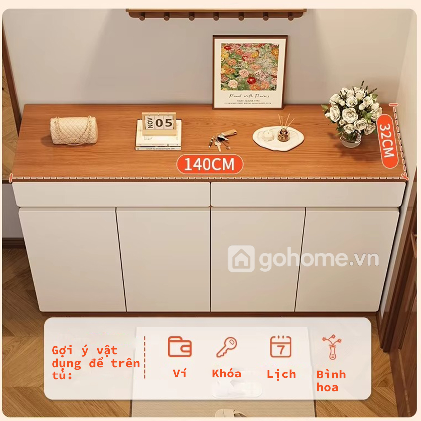 Khác với những mẫu tủ giày nhỏ truyền thống, tủ giày này được thiết kế dài 1,4 mét – rộng rãi để sắp xếp giày dép cho cả gia đình. Mặt tủ rộng 32cm, bạn có thể tận dụng để đặt sách, khung ảnh, lọ hoa hoặc để ví, chìa khóa, khẩu trang mỗi khi ra vào nhà.