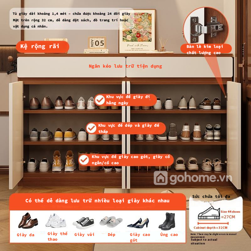 Chiếc tủ dài khoảng 1,4m nhưng chứa được tới 24 đôi giày – từ giày da, giày vải, dép, giày thể thao đến cả giày cao gót và ủng cao. Sở hữu thiết kế phân khu thông minh, chiếc tủ giúp bạn sắp xếp từng đôi giày ngăn nắp, dễ tìm, dễ lấy, đảm bảo mọi thành viên trong gia đình đều hài lòng.