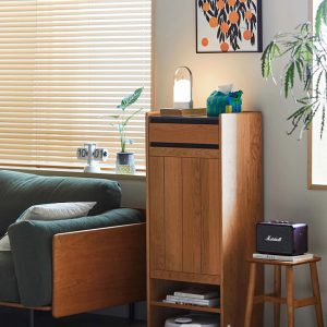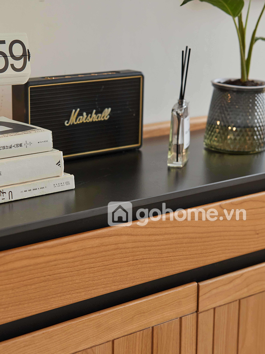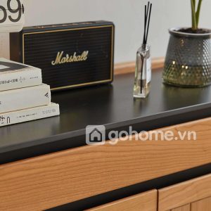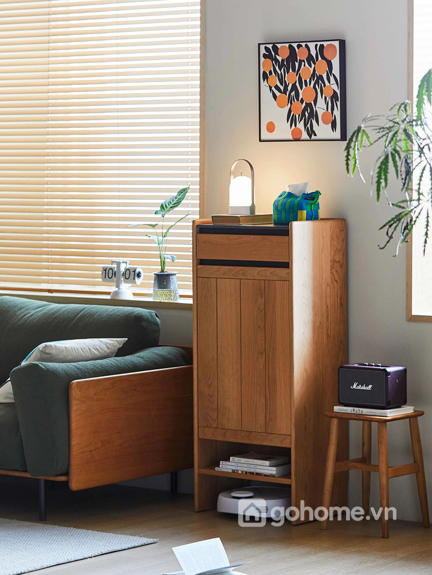 Ấn tượng đầu tiên đến từ chất liệu gỗ tự nhiên/hoặc gỗ công nghiệp phủ vân gỗ cao cấp, tạo cảm giác ấm áp, gần gũi và sang trọng. Sản phẩm sở hữu thiết kế tinh gọn với đường nét tối giản, tỉ lệ hài hòa và từng chi tiết được chăm chút kỹ lưỡng – từ tay nắm âm, bản lề giảm chấn cho đến ngăn kéo tiện dụng phía trên.
