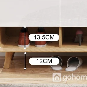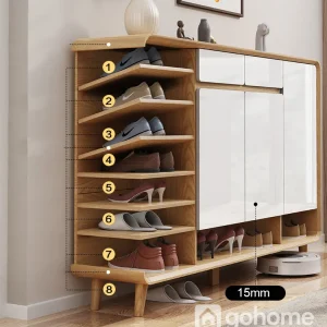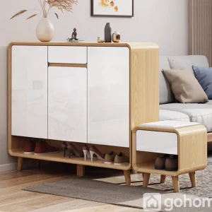 Sản phẩm được chia thành nhiều ngăn chứa, giúp lưu trữ từ 15 – 20 đôi giày dép, kết hợp ngăn hở bên dưới để giày đi thường xuyên. Đặc biệt, tủ còn có đôn ngồi nhỏ gọn, giúp bạn dễ dàng thay giày mỗi ngày – một chi tiết tinh tế nhưng cực kỳ tiện ích.
