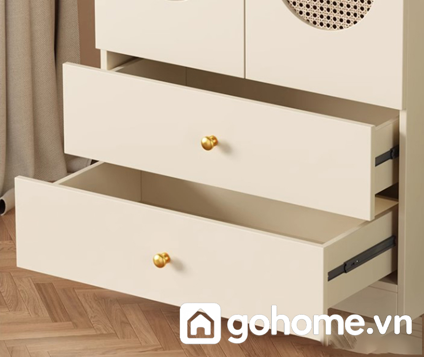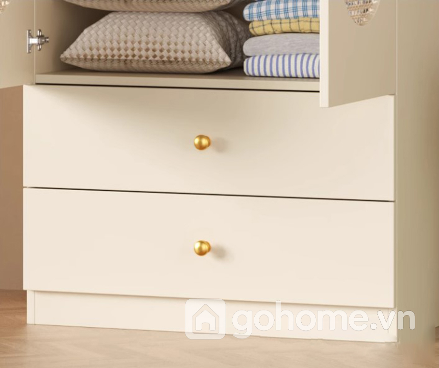 Tủ được trang bị thêm ngăn kéo tiện ích bên dưới, lý tưởng để cất giữ phụ kiện, tất, khăn hoặc các món đồ nhỏ gọn. Tay nắm chắc chắn, ray trượt mượt mà, đảm bảo trải nghiệm sử dụng êm ái và bền lâu.