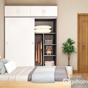 Thiết kế chia ngăn khoa học: một bên để treo quần áo dài, một bên gồm nhiều kệ nhỏ đựng chăn gối, vali, hộp phụ kiện, đồ chơi hay túi xách. Tất cả được sắp xếp gọn gàng, tiết kiệm diện tích tối đa.