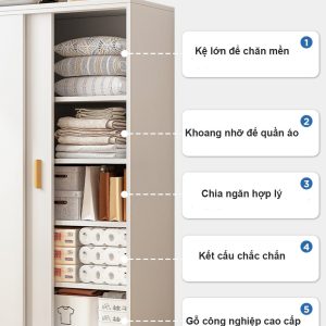 Mẫu tủ quần áo này sử dụng cánh trượt thông minh, giúp tiết kiệm tối đa không gian mở cửa, đặc biệt phù hợp với những căn phòng nhỏ hoặc căn hộ chung cư. Bên trong, tủ được chia thành nhiều ngăn khoa học, giúp bạn dễ dàng sắp xếp quần áo, chăn ga, hộp đựng đồ và các vật dụng sinh hoạt khác.