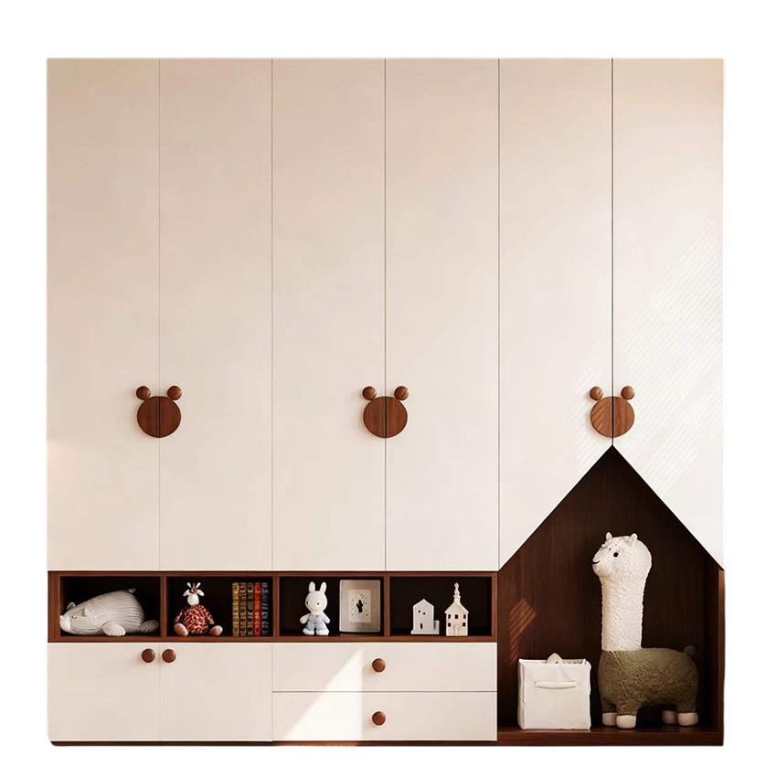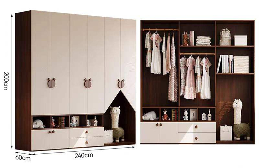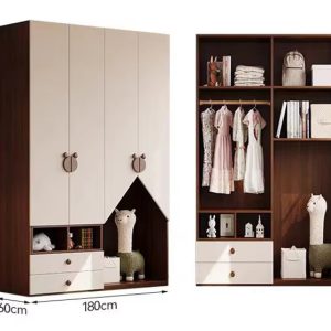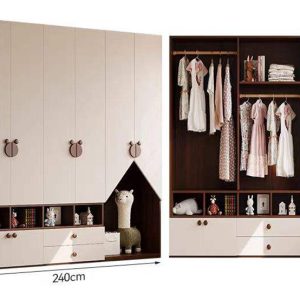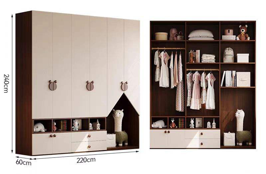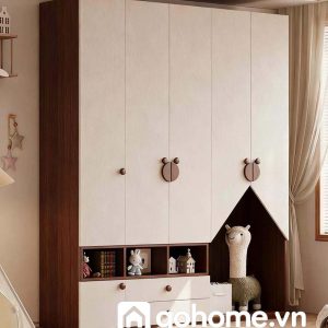 Với thiết kế cao sát trần và nhiều ngăn chứa phân khu hợp lý, bố mẹ có thể thoải mái sắp xếp quần áo theo mùa, chăn gối, đồ chơi hoặc phụ kiện của bé. Tông trắng – nâu hiện đại dễ phối với mọi phong cách nội thất như Scandinavian, Minimalist, Korean Style… giúp căn phòng thêm sáng, rộng và ấm áp.