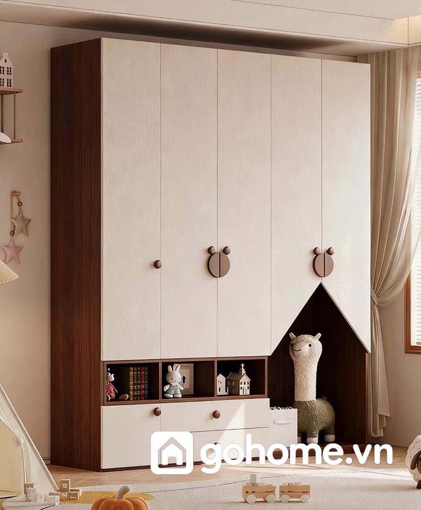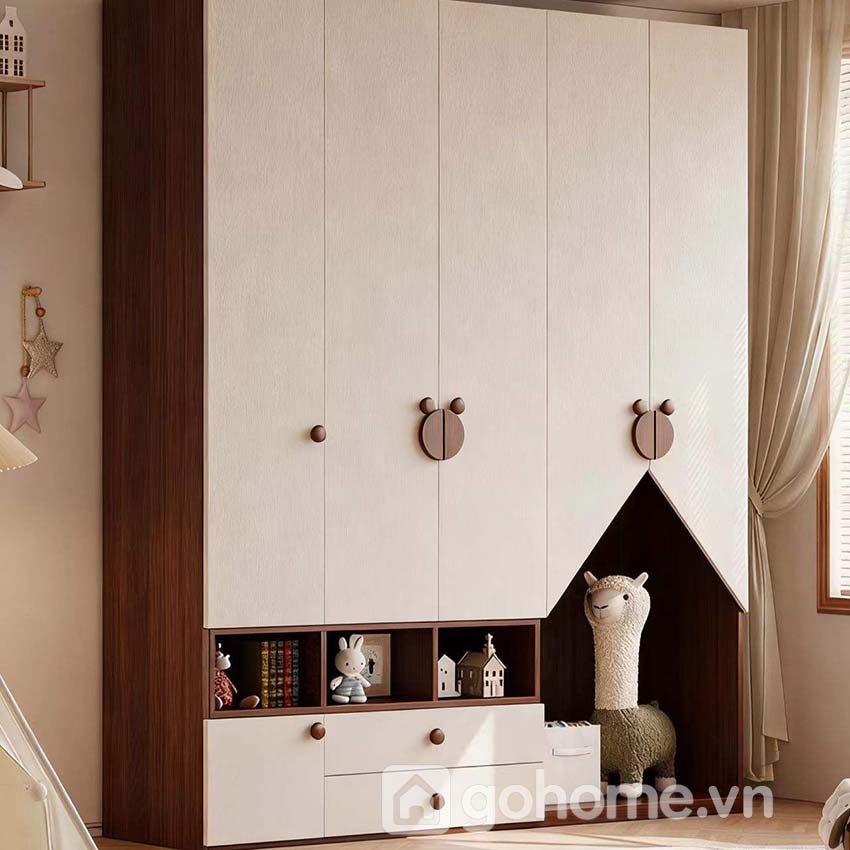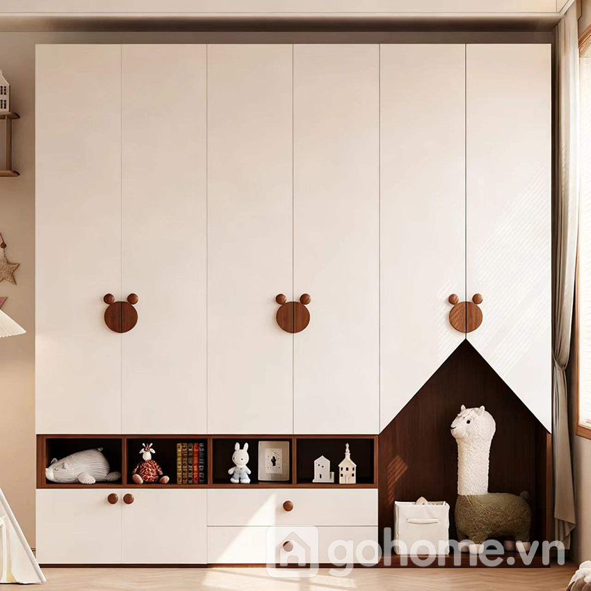 Mẫu tủ quần áo trẻ em này được thiết kế dựa trên tiêu chí an toàn – tiện dụng – kích thích sáng tạo. Phong cách hiện đại kết hợp đường nét tối giản và họa tiết tay nắm gấu ngộ nghĩnh tạo nên một tổng thể mềm mại, hài hòa, phù hợp cho cả bé trai lẫn bé gái. Đặc biệt, phần hốc trang trí bên dưới và khu vực “nhà mini” ở góc phải giúp bé có thêm không gian trưng bày đồ chơi, búp bê hoặc sách yêu thích, mang đến cảm giác như có một “ngôi nhà riêng” ngay trong căn phòng của mình.