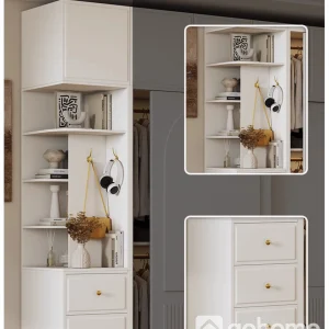 Ngoài ra, sản phẩm còn tích hợp kệ mở và hộc kéo tiện lợi, cho phép lưu trữ phụ kiện, đồ trang trí hoặc sách vở – biến tủ quần áo không chỉ là nơi cất giữ mà còn là góc decor đẹp mắt trong phòng.