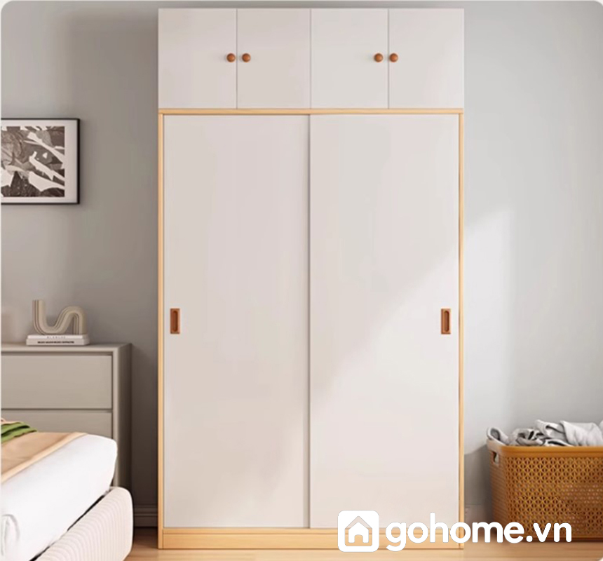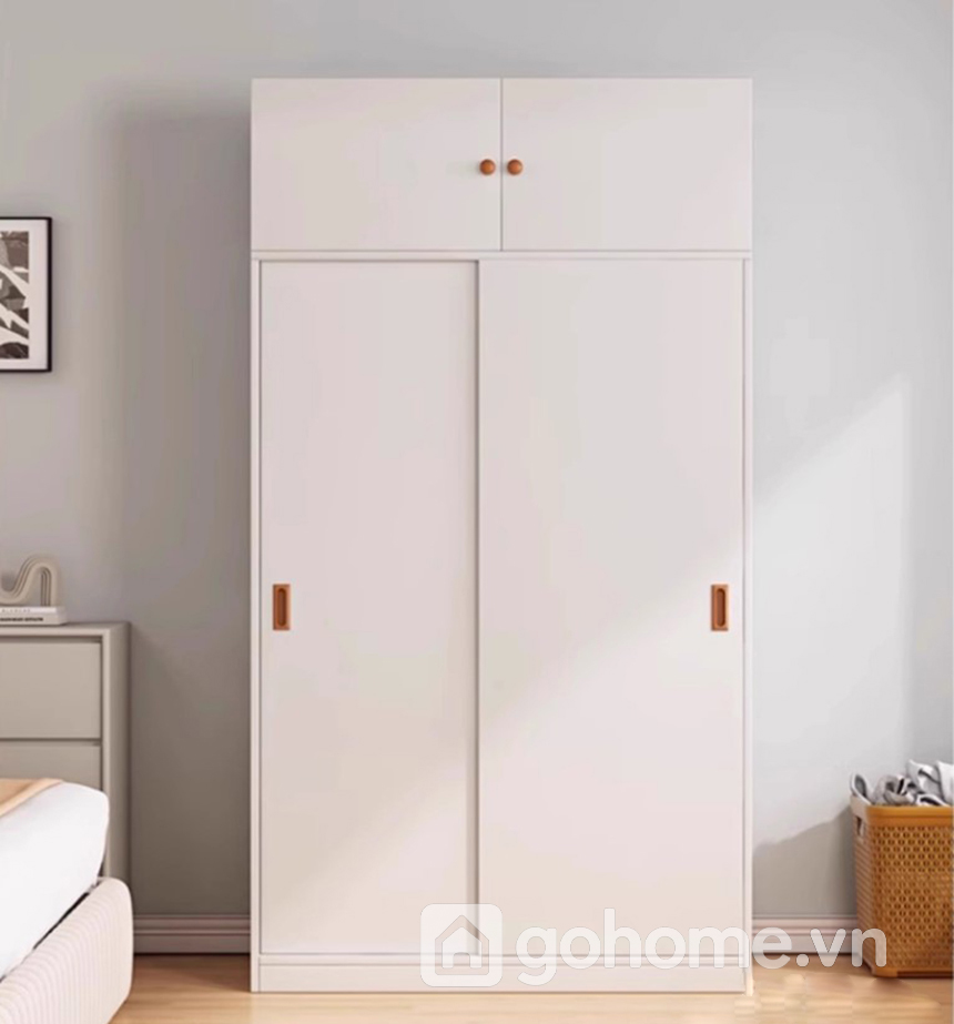 Tủ sử dụng cửa lùa (cửa trượt) giúp tiết kiệm không gian mở tủ so với cửa truyền thống. Hệ ray trượt êm ái, chắc chắn, dễ thao tác – phù hợp đặt sát tường hoặc nội thất khác mà vẫn đảm bảo mở tủ dễ dàng, không vướng víu.