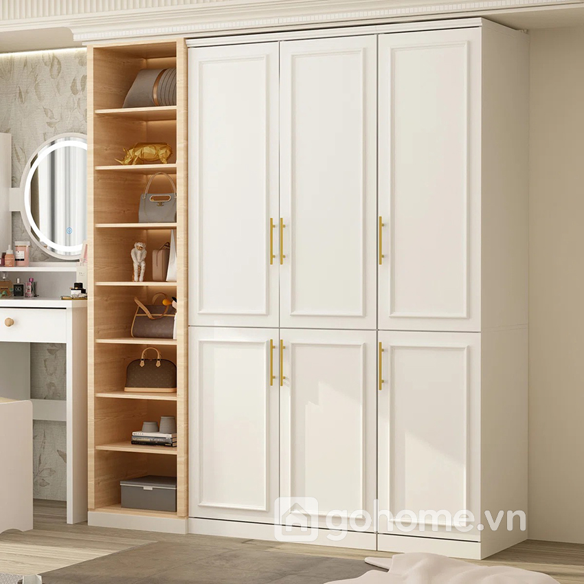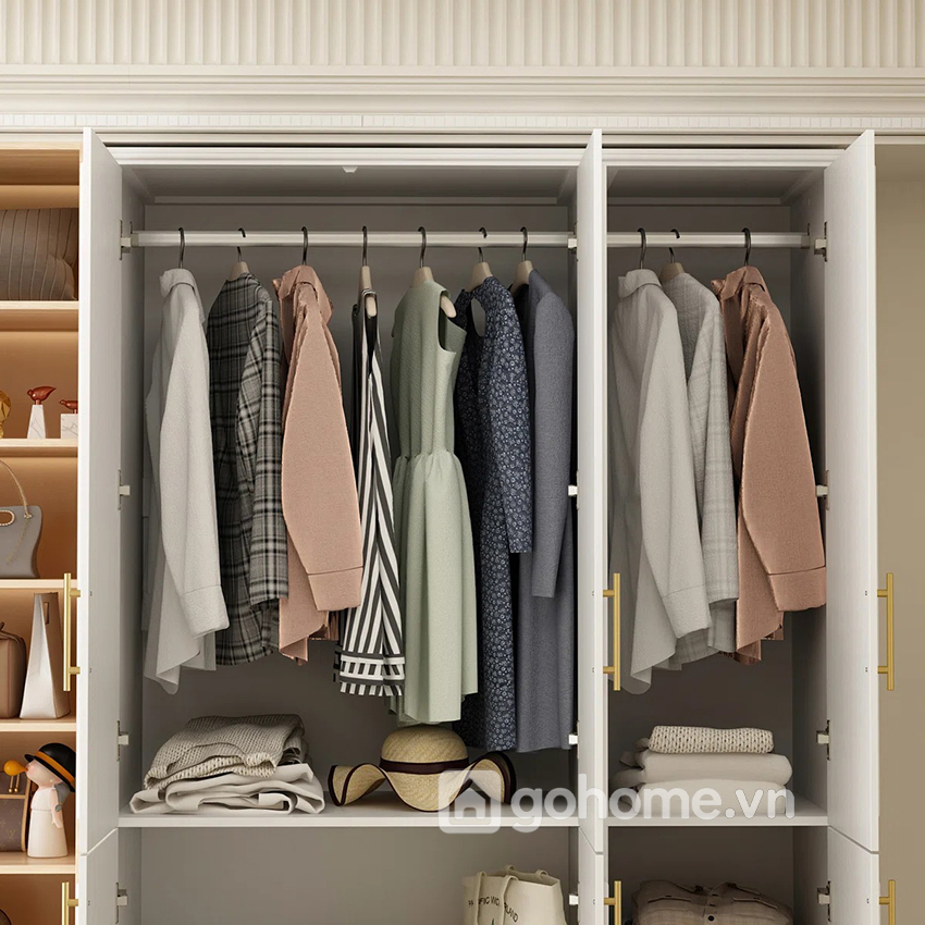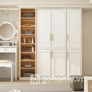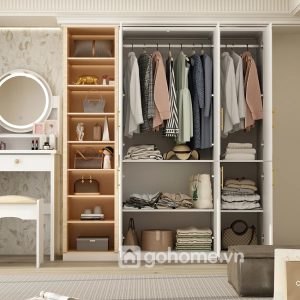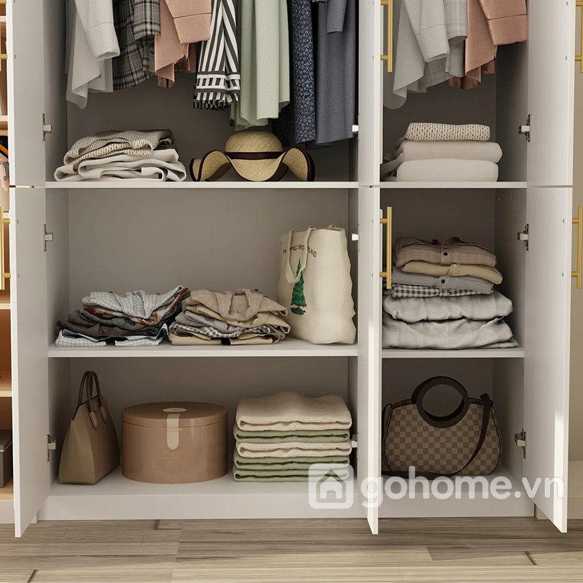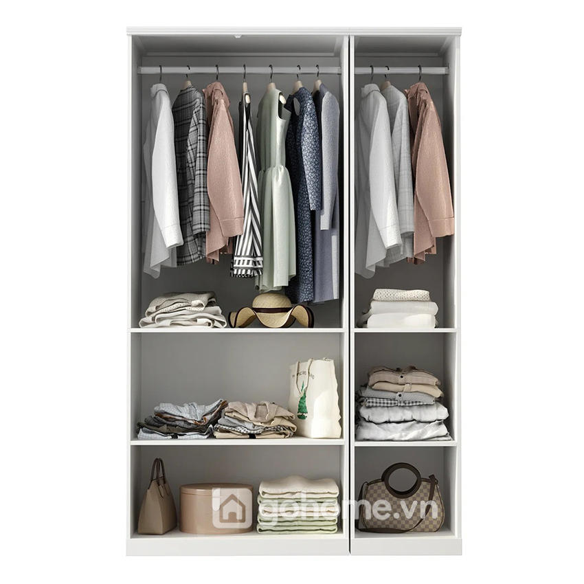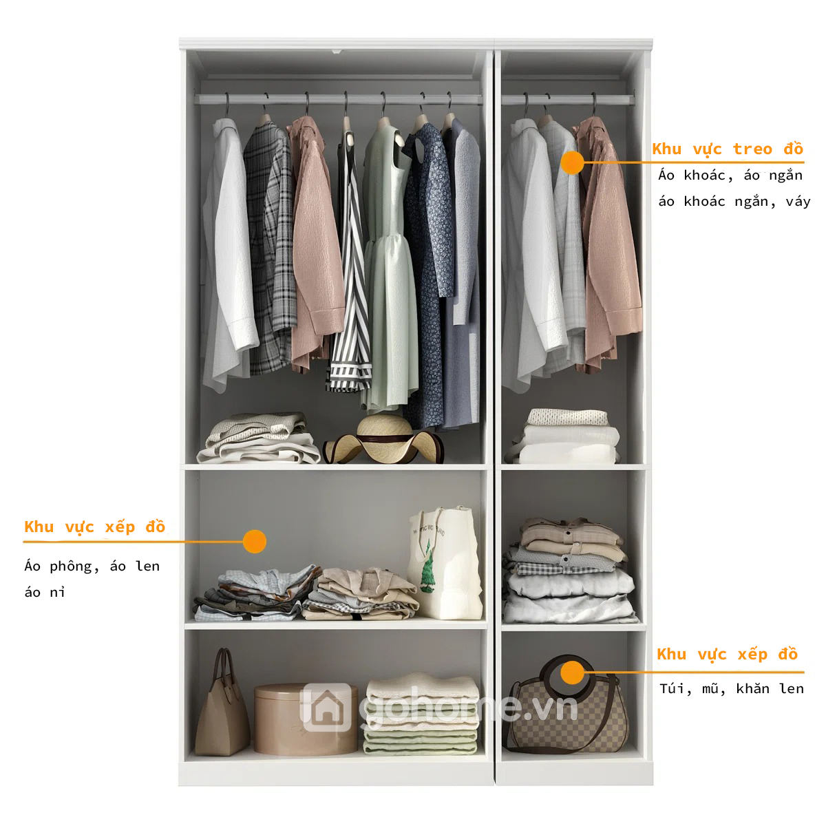 Tủ được thiết kế gồm 3 khoang lớn và 1 kệ trang trí mở, giúp phân loại quần áo và phụ kiện cực kỳ dễ dàng: