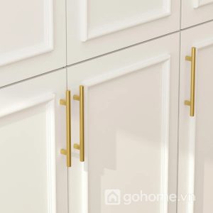Tủ sử dụng tone trắng kem kết hợp tay nắm vàng ánh kim, tạo cảm giác sang trọng nhưng không phô trương. Nhờ gam màu trung tính, sản phẩm phù hợp với: