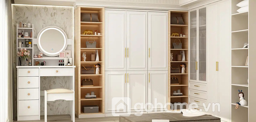 ✔ Tiết kiệm diện tích – kết hợp tủ quần áo + kệ decor