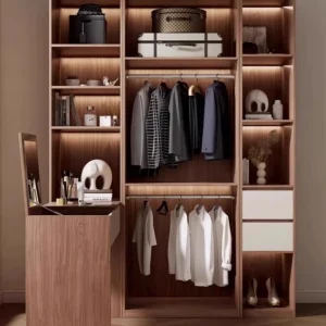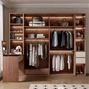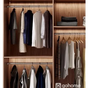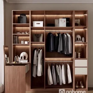 Bố trí nhiều ngăn treo quần áo, hộc kéo, kệ ngang tiện lợi.