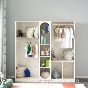 Bên cạnh đó, thiết kế tủ chia thành nhiều khoang chứa khoa học: khoang treo quần áo dài, ngăn để gấp đồ, kệ mở trang trí và hệ ngăn dưới chạy nan dọc hiện đại. Tất cả tạo nên một chiếc tủ vừa đẹp, vừa tiện dụng, dễ dàng hòa hợp với nội thất sẵn có trong phòng ngủ.