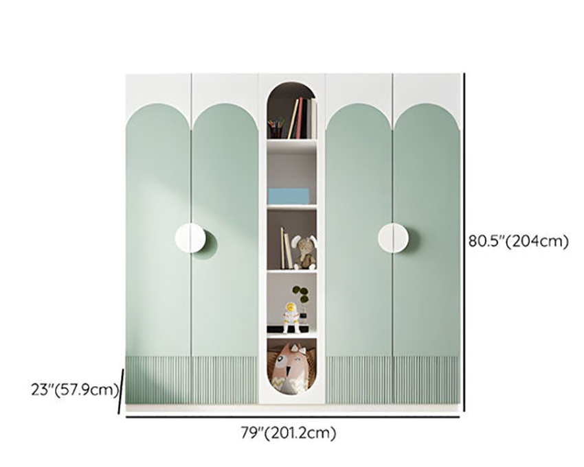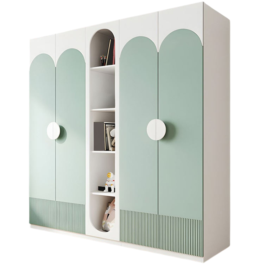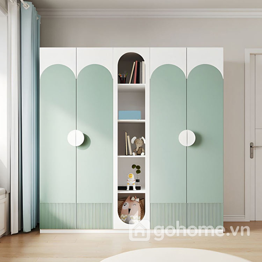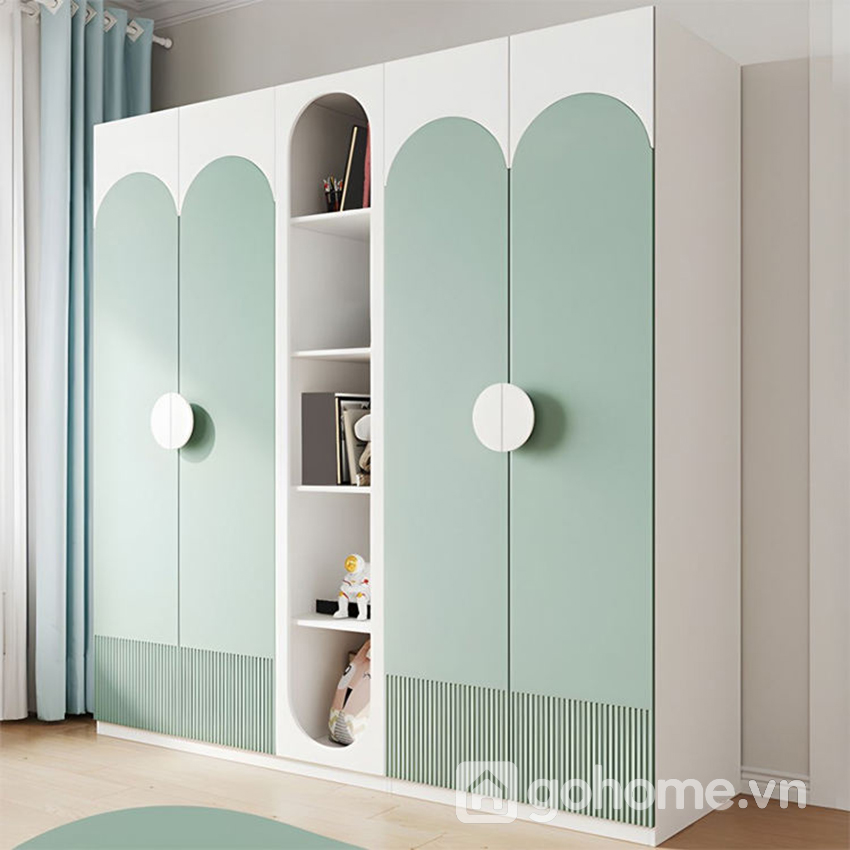Mẫu tủ hiện đại với phối màu mint – trắng dịu mắt, bo cong mềm mại và đường nét tối giản sẽ ngay lập tức “làm mềm” cả căn phòng, tạo cảm giác dễ chịu ngay khi bước vào. Đặc biệt, thiết kế mở ở giữa giúp trưng bày đồ decor, sách hoặc phụ kiện cực xinh – biến tủ quần áo không chỉ là nơi chứa đồ mà còn là điểm nhấn trang trí đầy tinh tế.