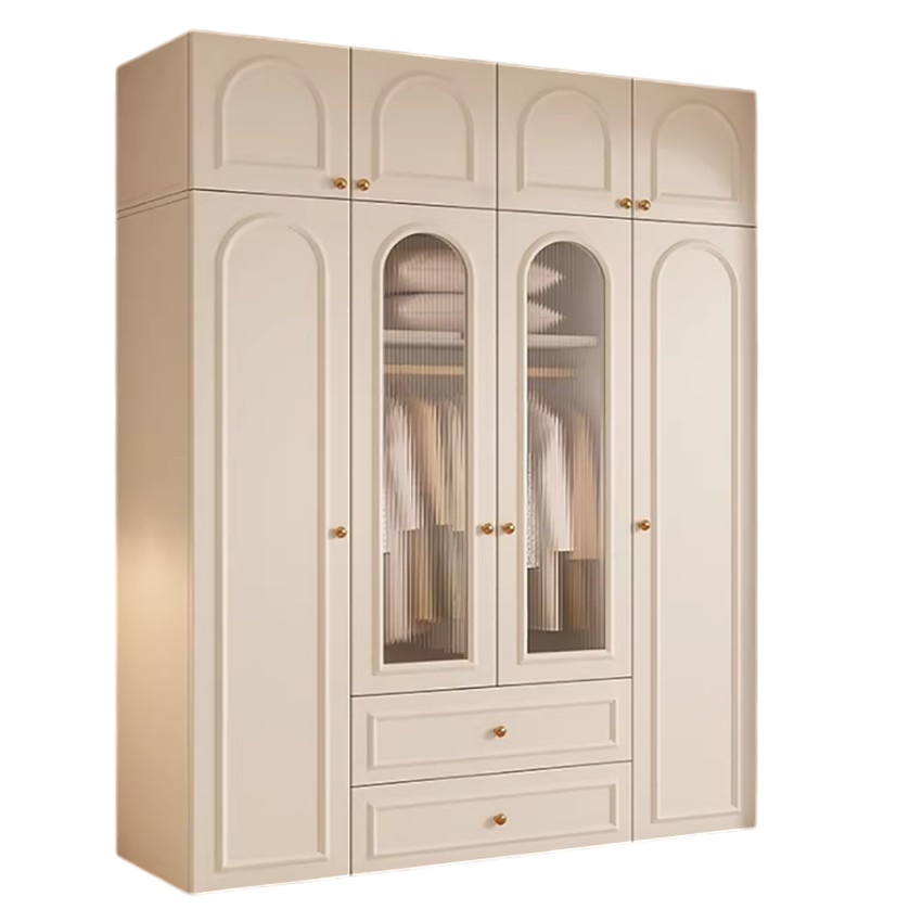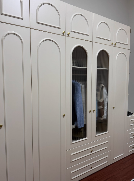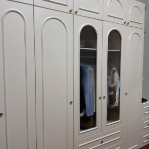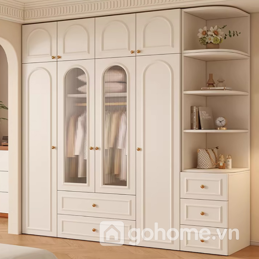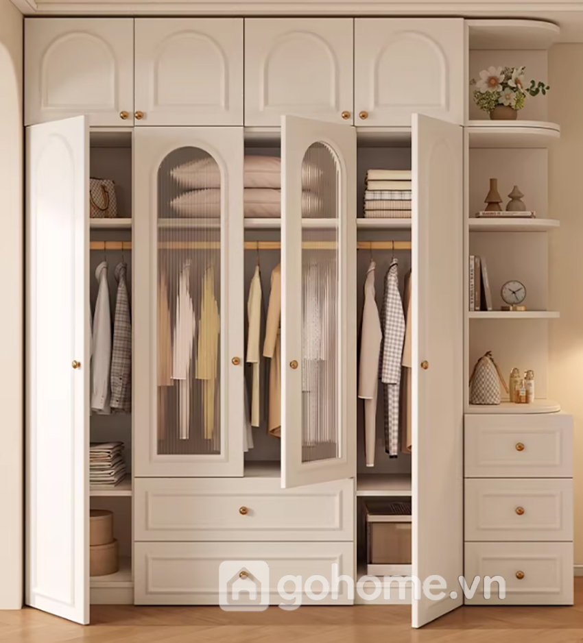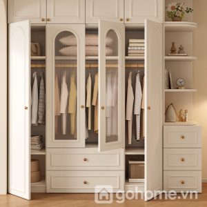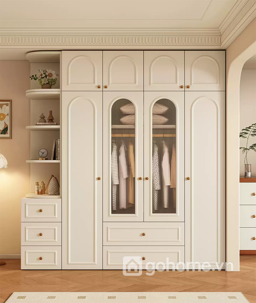 Những đường cong nhẹ trên cánh tủ tạo nên cảm giác mềm mại, sang trọng nhưng vẫn giữ được sự tối giản cần thiết. Thiết kế cửa kính ở trung tâm không chỉ giúp tăng tính thẩm mỹ mà còn giúp bạn dễ dàng quan sát và lựa chọn trang phục.