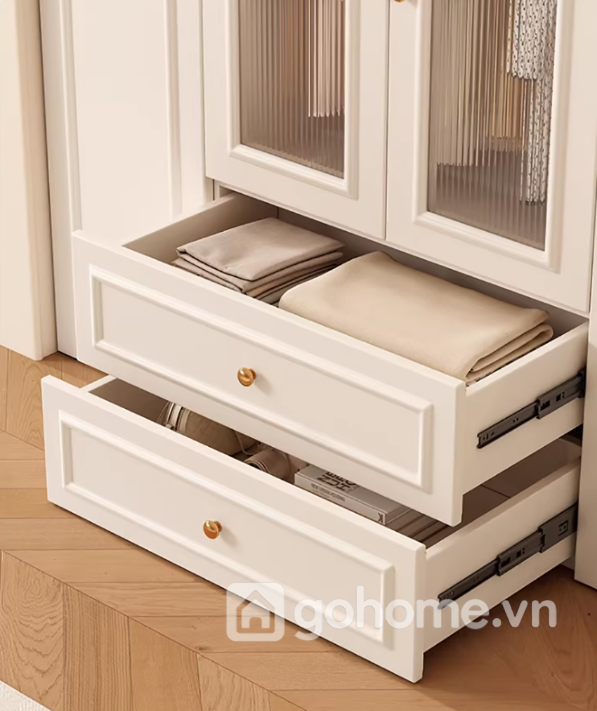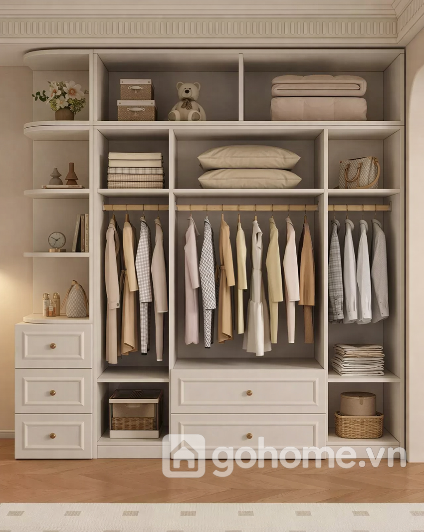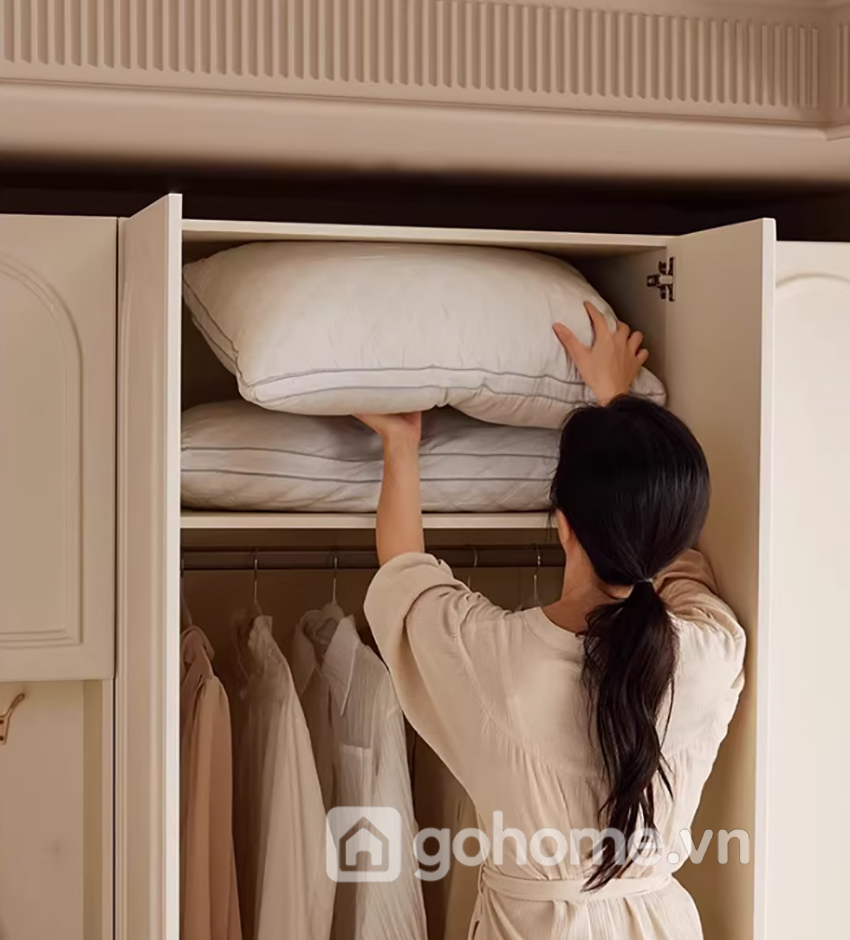 Bên cạnh đó, bố cục ngăn chứa được phân chia khoa học, giúp việc sắp xếp quần áo trở nên gọn gàng hơn. Đây là điểm cộng lớn cho những gia đình yêu thích sự ngăn nắp và tiện lợi.