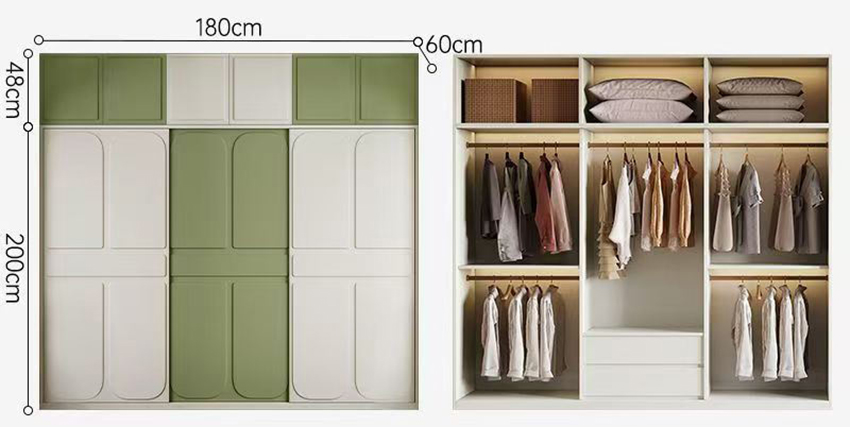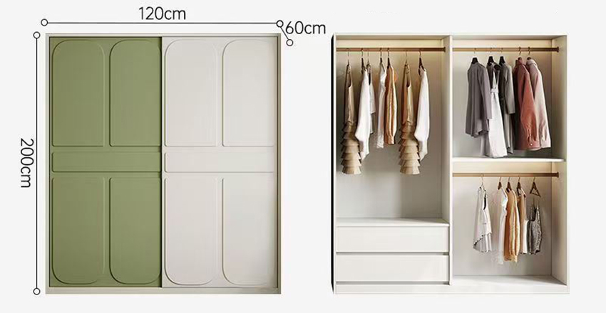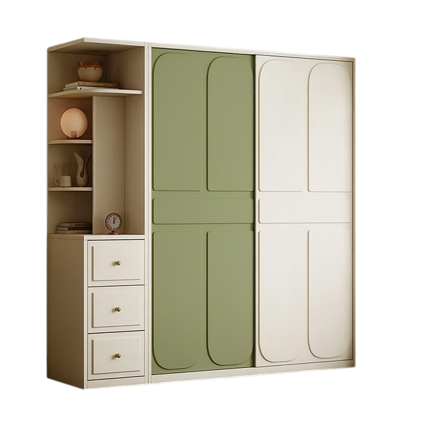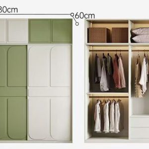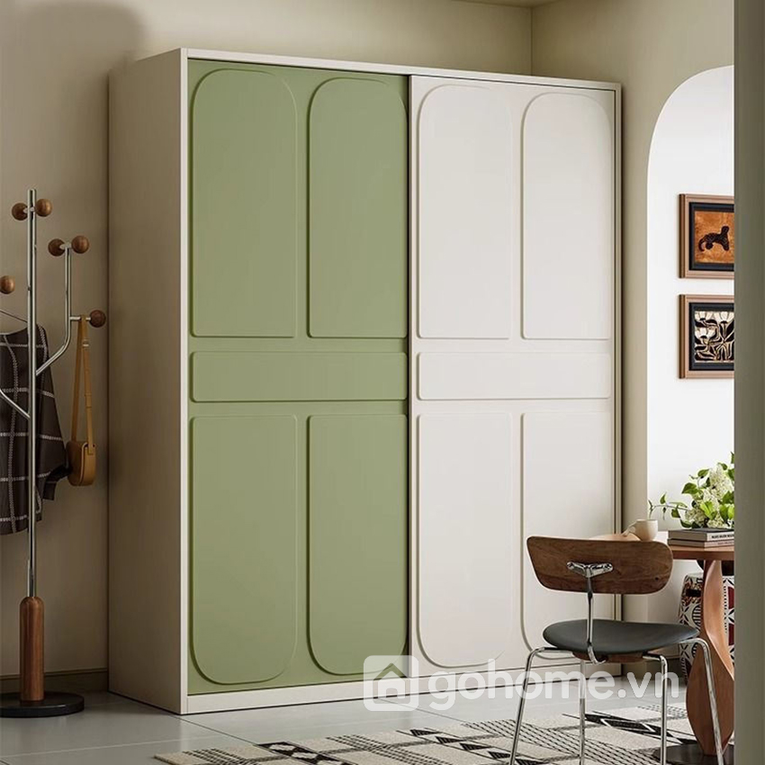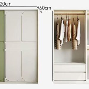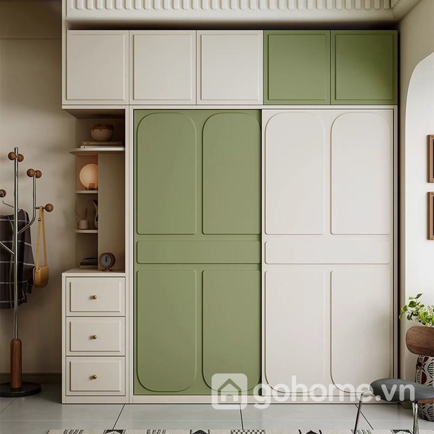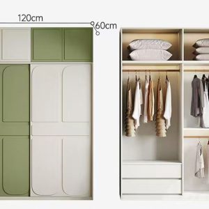 Lấy cảm hứng từ phong cách minimalism – tối giản nhưng không đơn điệu, mẫu Tủ Quần Áo Tối Giản Thiết Kế Thanh Lịch ghi điểm nhờ những tông màu dịu nhẹ, đường nét mềm mại và bố cục thông minh. Sự kết hợp giữa gam trắng kem và xanh oliu nhạt (hoặc các sắc màu pastel khác khi thay đổi phối màu) mang lại cảm giác ấm áp, tự nhiên nhưng không kém phần thời thượng.