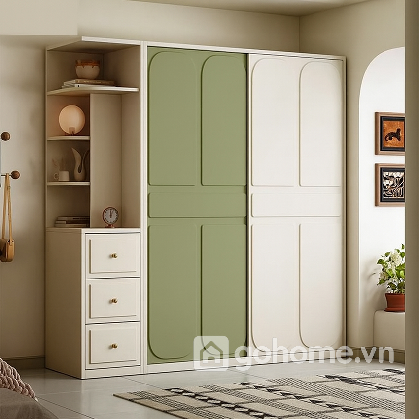 Điểm nổi bật của thiết kế này là cánh trượt liền mạch, phù hợp với những phòng ngủ nhỏ hoặc cần tiết kiệm diện tích. Cùng với đó là hệ ngăn kéo và kệ mở cạnh tủ, giúp gia chủ có nơi trưng bày vài món decor xinh xắn hoặc đặt đồng hồ, sách vở, khung ảnh.