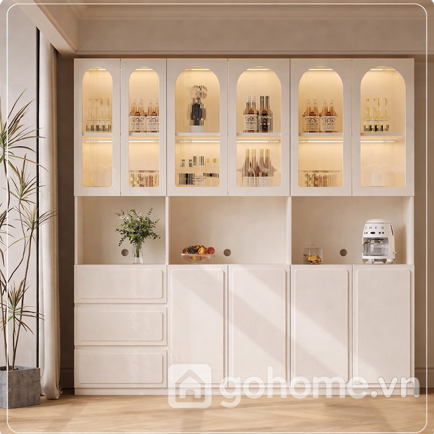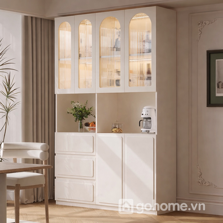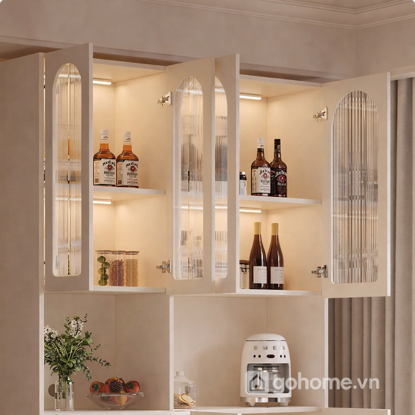 Phần tủ trên được thiết kế với cánh kính vòm phối sọc mờ, mang hơi thở châu Âu cổ điển nhưng vẫn giữ được sự hiện đại nhẹ nhàng. Các đường cong vòm mềm mại khiến tổng thể trở nên thanh thoát, nữ tính và dễ hòa nhập với các không gian như phòng ăn, phòng trà hoặc lối đi thông phòng.