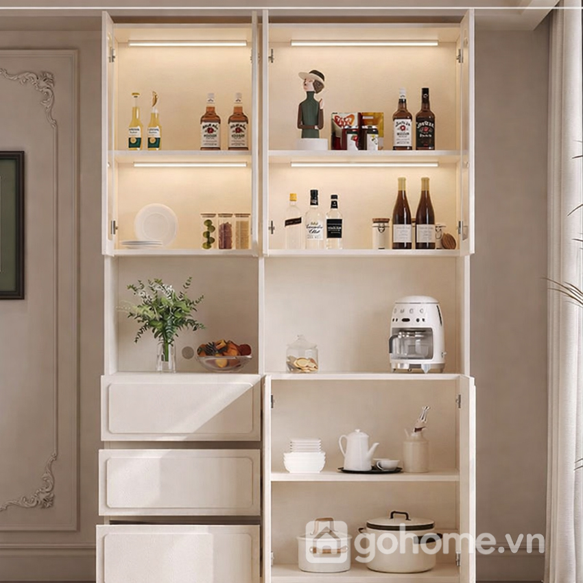 Tầng giữa gồm hai ô hở tiện lợi để trưng bày máy pha cà phê, bình thủy tinh, cây xanh mini hoặc đồ trang trí nhỏ – vừa tiện dụng, vừa tạo chiều sâu thị giác cho tổng thể thiết kế. Tầng dưới là hệ tủ kín với 3 ngăn kéo – 2 cánh mở chứa được ly, đĩa, hộp rượu, đồ khô hoặc các vật dụng ít dùng khác